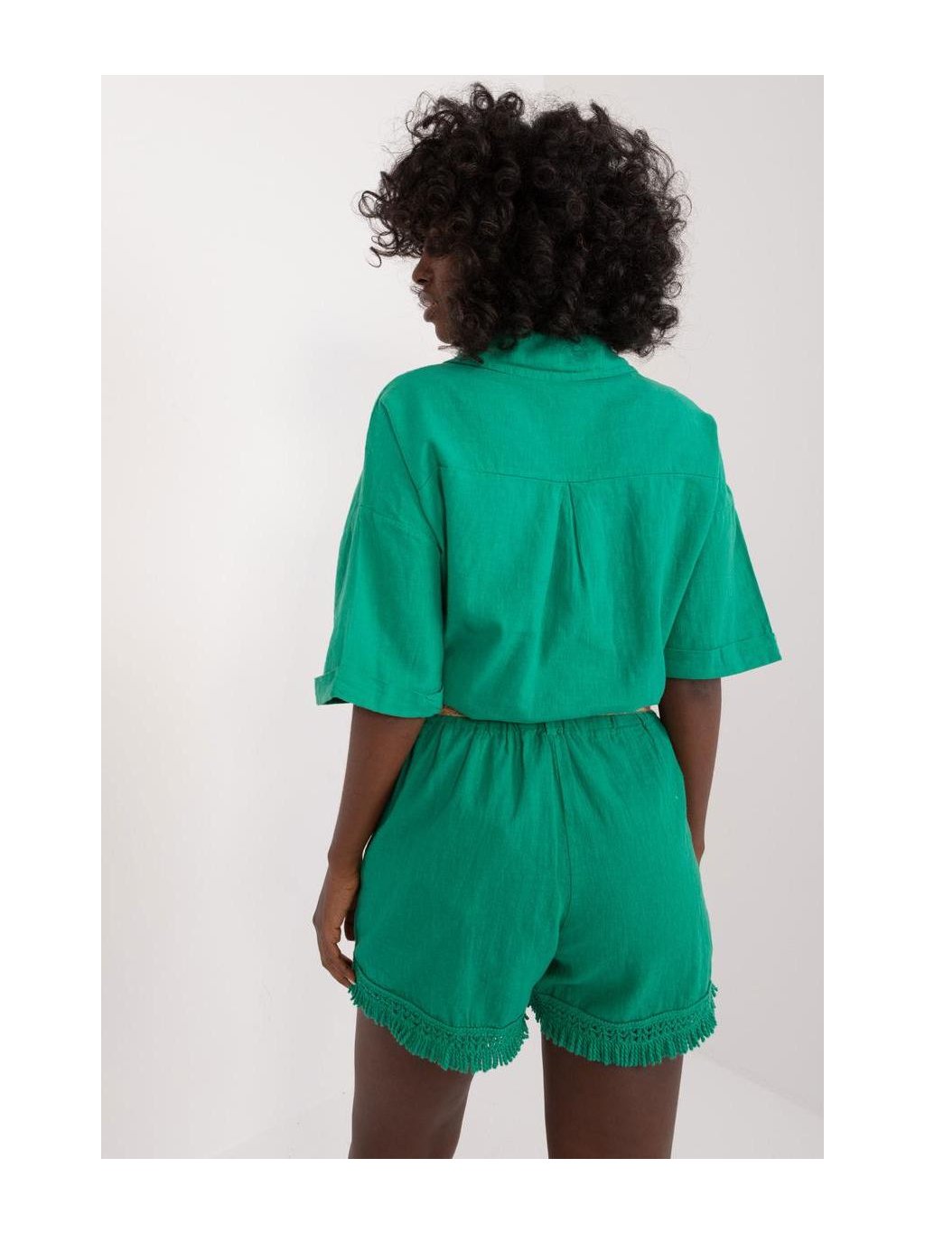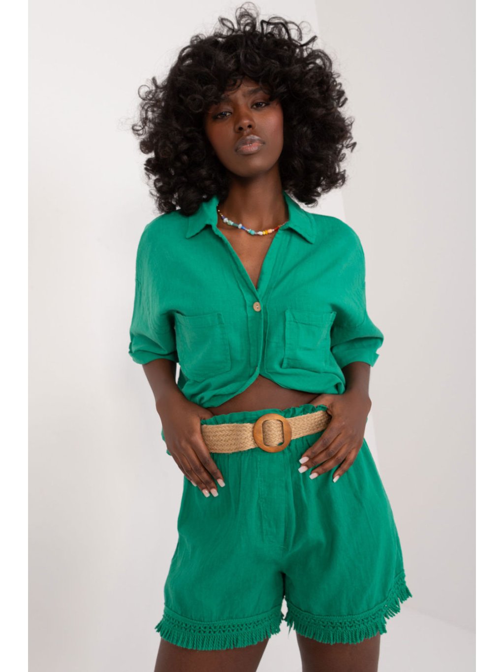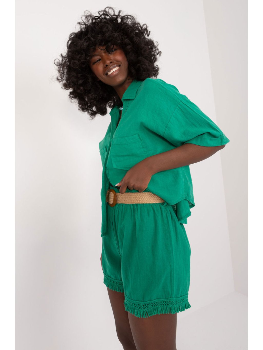 Tyto látkové šortky jsou ideální volbou pro každodenní letní stylizaci a dodají každému outfitu ležérní šarm. Jsou vyrobeny z lehkého lnu s příměsí bavlny a nabízejí prodyšnost a pohodlí i v těch nejteplejších dnech. Jejich široké nohavice s třásněmi dodávají charakter a lehkost a celému outfitu originální vzhled. Stylizované v ležérním duchu se tyto šortky hodí k mnoha různým outfitům. Díky jednobarevnému materiálu jsou univerzální a lze je snadno kombinovat s dalšími kousky ve vašem šatníku. Jejich vysoký střih navíc zdůrazňuje pas a dodává jim ženský nádech. Šortky mají v pase přezku, která vám umožní přizpůsobit si je své siluetě. Tyto šortky, které se skvěle hodí na každodenní procházky, setkání s přáteli nebo letní výlety, budou dokonalým doplňkem vašeho letního šatníku a poskytnou vám styl a pohodlí po celý den.