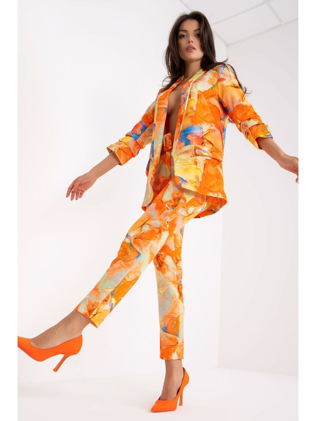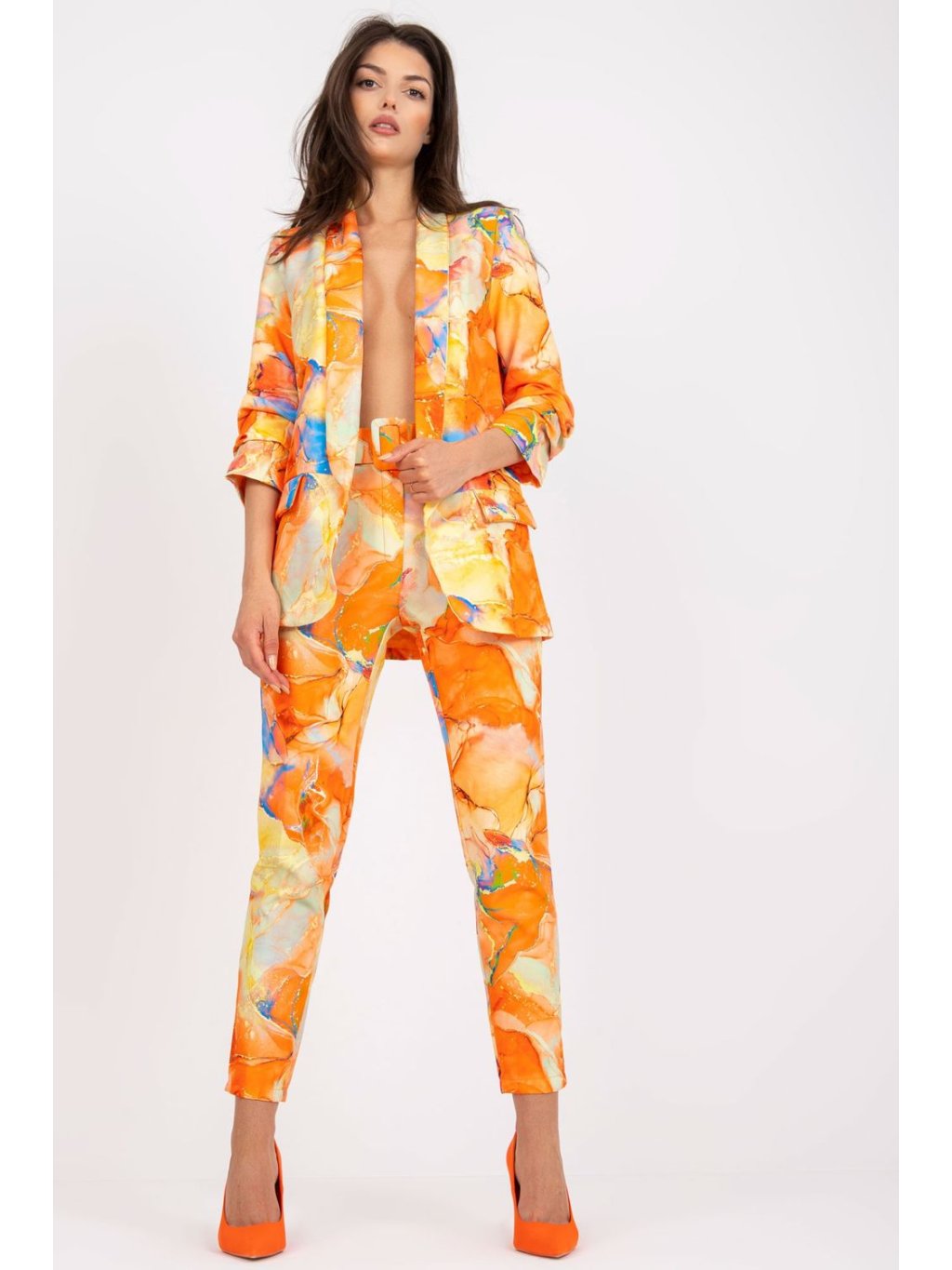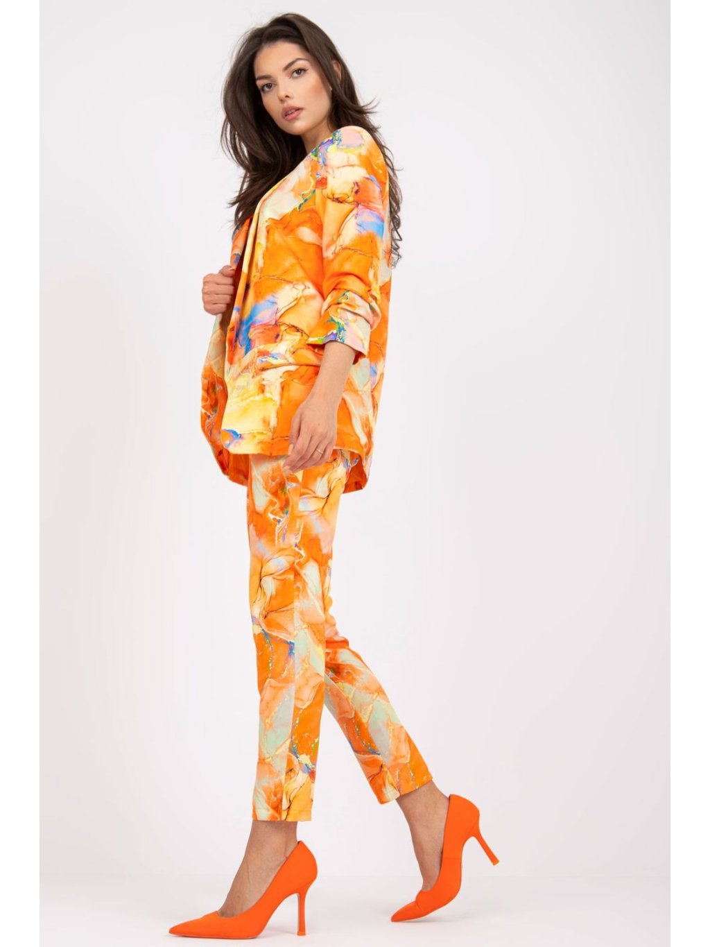 Bunda rovného střihu z barevné látky s podšívkou. Polštáře a záhyby na ramenou. Sako s 3/4 rukávy, bez knoflíku. K soupravě se hodí kalhoty stejné barvy.