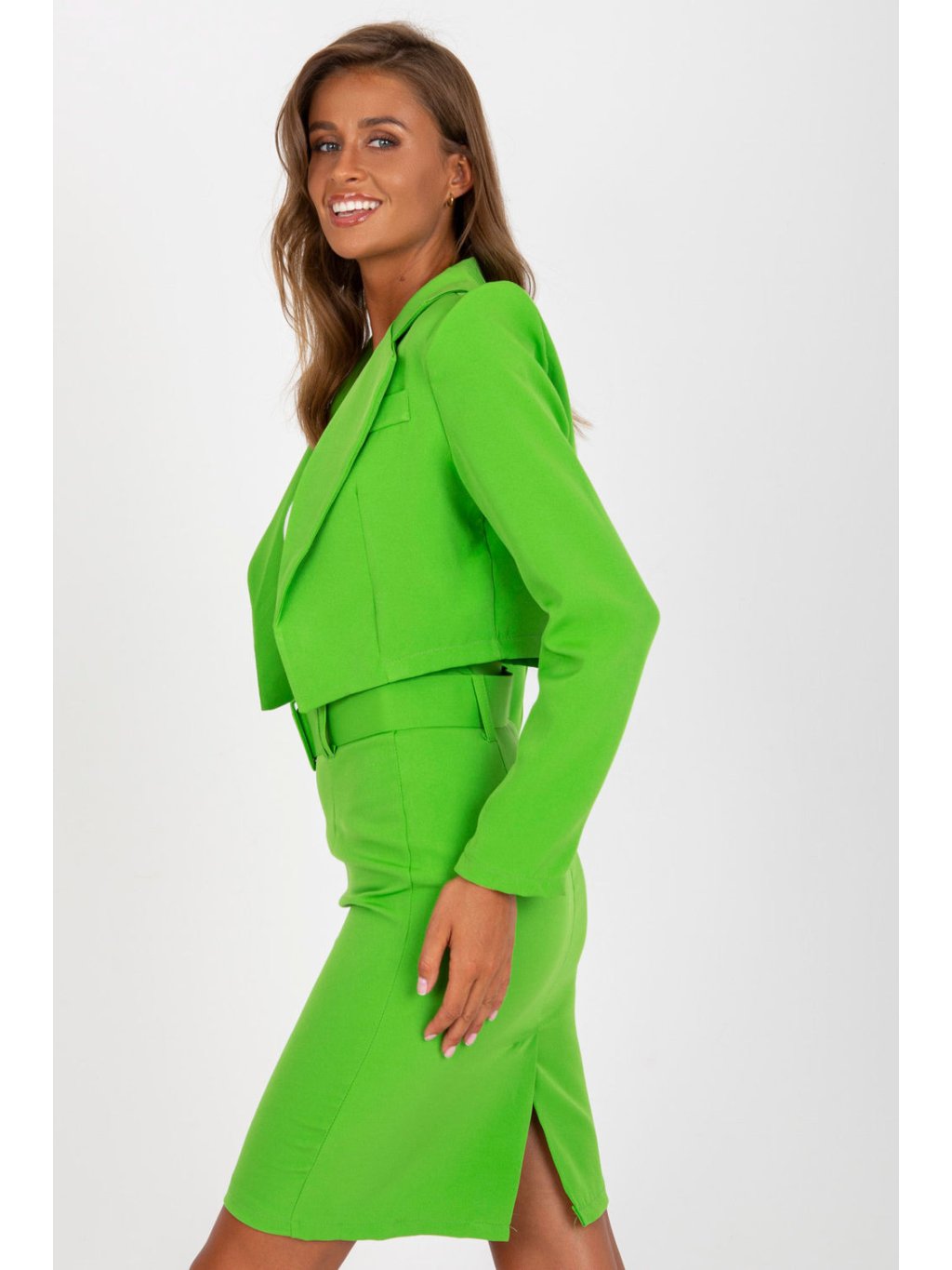 Krátká bunda s dlouhými rukávy, všité ramenní vycpávky. Sako se širokými klopami a imitací kapes. Bunda bez zapínání.