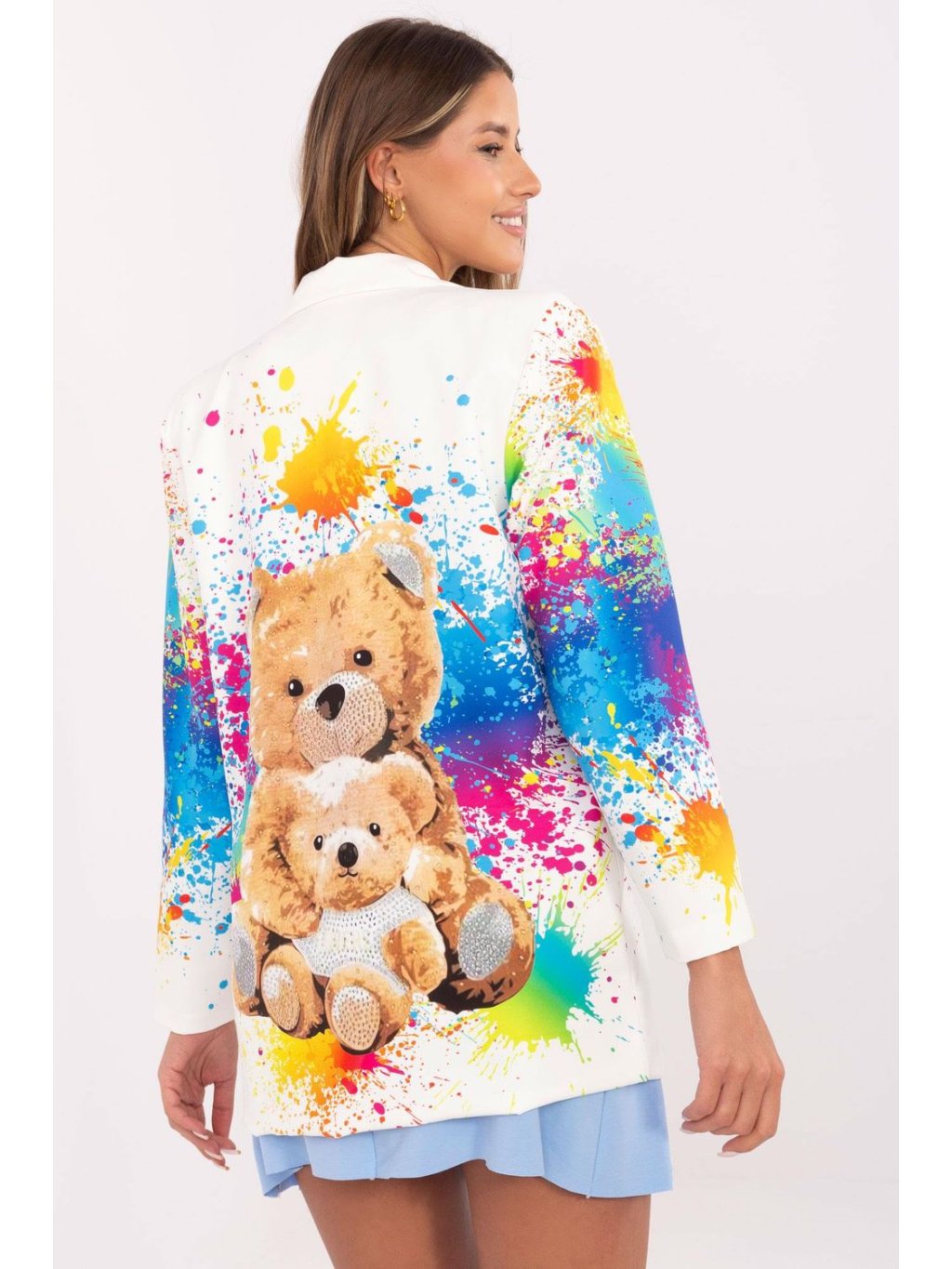 Elegantní dámský sako v casual stylu, skvělý na každodenní nošení, do práce, na večírek a na slavnostní příležitosti. Vyrobený z lehké směsi viskózy a polyesteru, ideální na jaro a léto. Barevný potisk dodává moderní a odvážný charakter, čímž se odlišuje od klasických modelů. Sako má standardní délku, dlouhý rukáv a jednoduché zapínání na knoflík, které zdůrazňuje jeho elegantní vzhled. Vložené polštářky na ramenou dodávají výraznosti a jemně tvarují postavu. Klasické límce a podšívka dodávají celkově stylové dokončení. Bez podšívky, takže se skvěle hodí do teplejších dní. Ideální volba pro ženy, které chtějí spojit eleganci s moderním designem a pohodlím.
