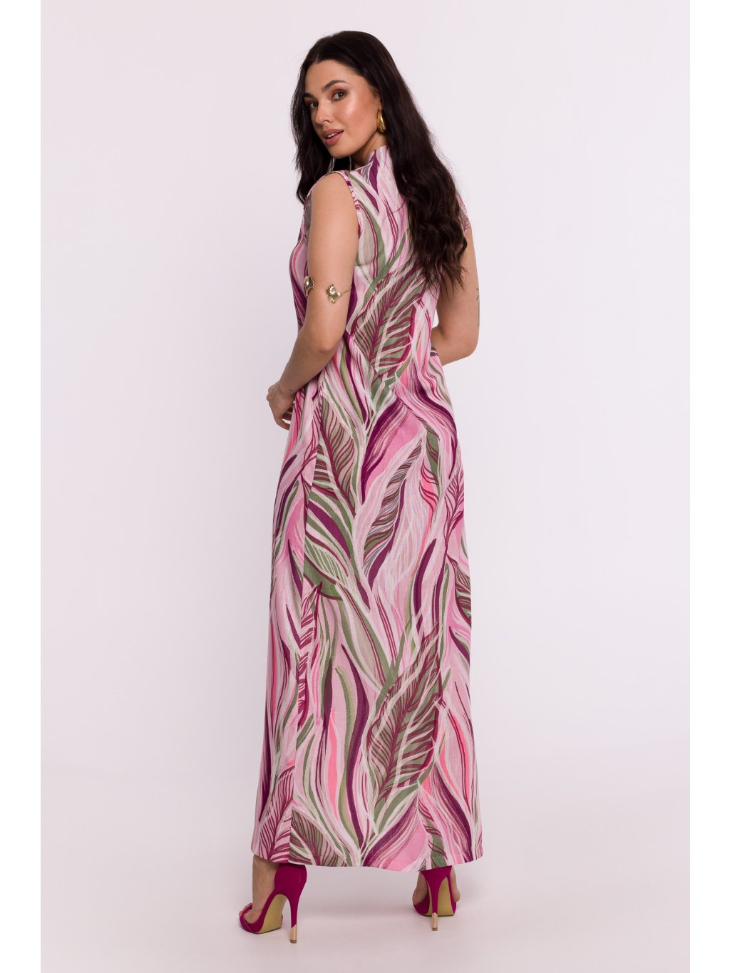 Šaty výjimečného designu z lehké tkaniny s originálním potiskem jsou skutečnou poctou polskému návrhářskému řemeslu. Tento model jsou maxi šaty, jejichž charakter podtrhuje smyslný výstřih ve tvaru písmene V. Pod výstřihem je navíc umístěno elegantní překrytí, které dodává kreaci jemnost a styl. Šaty jsou praktické a rychle se oblékají, protože se nosí přes hlavu, takže jejich nošení je velmi pohodlné. Střih bez rukávů dodává šatům lehkost a působí vzdušným letním dojmem. Absence podšívky zase podtrhuje lehkost materiálu a umožňuje pokožce volně dýchat. Na boku šatů je umístěn decentní rozparek, který dodává kreaci rafinovaný pohyb a zdůrazňuje ženskou siluetu. Látka s originálním potiskem je jedinečným prvkem, který dodává šatům osobní nádech a činí je jedinečnými. Návrh a výroba šatů probíhá v Polsku, což dokazuje závazek vůči módnímu průmyslu této země. Tyto šaty jsou nejen vyjádřením individuálního stylu, ale také hrdosti na polské dědictví tvořivosti a řemeslné zručnosti.