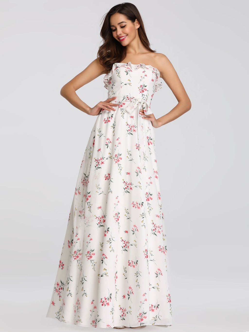Novinka. Krásné šaty vhodné i pro družičky. Bez rukávů a bez ramínek, volánky na prsou, skrytý zip na zádech. Šaty mají pásek, lze nosit i bez. Mají vložené vycpávky, lze nosit bez podprsenky.