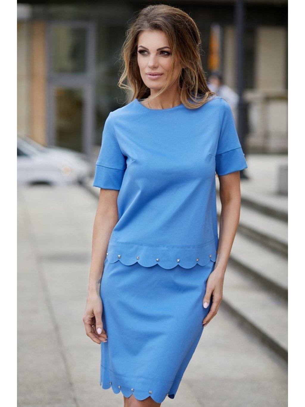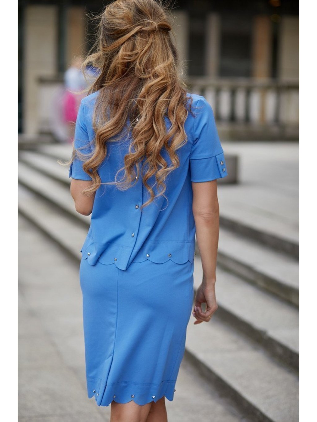 Působivý komplet v krásné barvě, který se skládá z halenky a sukně. Halenka s rukávy po lokty zdobenými knoflíky, tužková sukně. Ideální volba pro mnoho příležitostí.