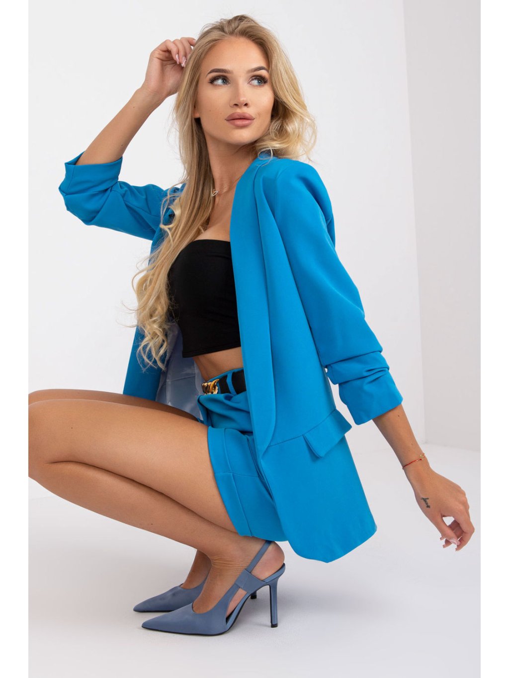 Elegantní souprava sestávající ze saka a šortek. Sako s 3/4 rukávy, podšité, na ramenou našité polštářky. Šortky s vysokým sedem a elastickým pasem. Kapsy na bocích. Šortky s ozdobným páskem. Ideální sada pro mnoho příležitostí.