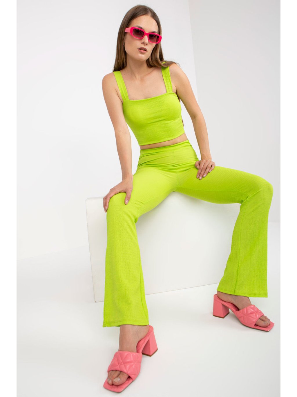 Souprava se skládá z topu a dlouhých kalhot. Krátký top s vyztuženými košíčky, obdélníkový výstřih. Dlouhé kalhoty s vysokým sedem a širokými nohavicemi, v pase na gumu.