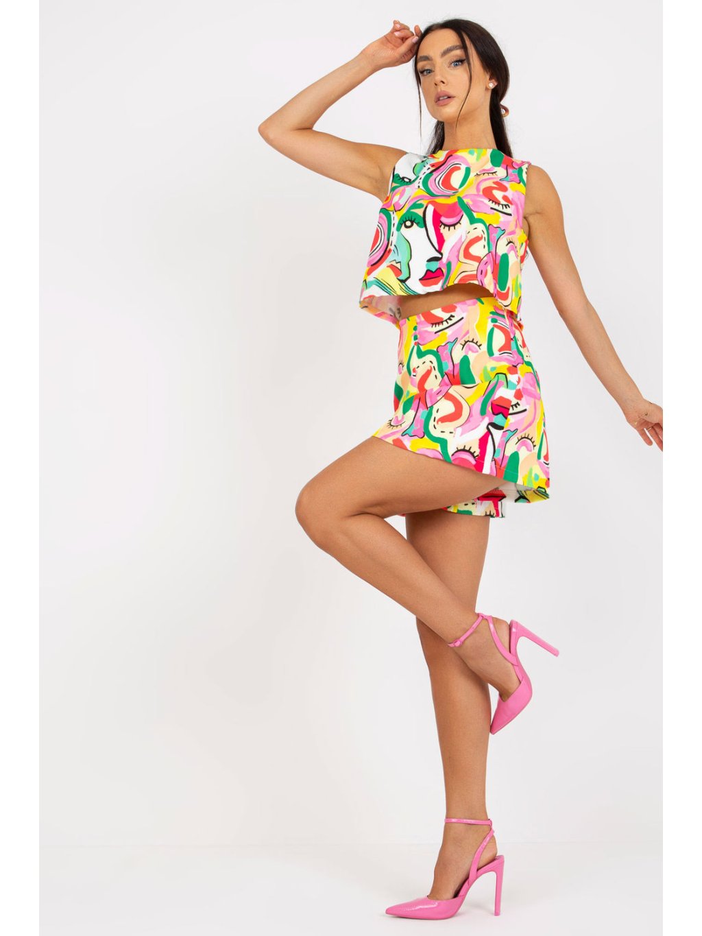 Letní souprava sestávající z topu a šortek. Krátký top volného střihu s ozdobným zavazováním na zádech. Šortky se širokými nohavicemi, krytý zip, elastický pas. Sada je ideální pro mnoho příležitostí.