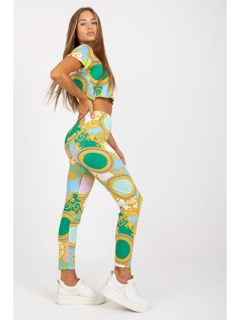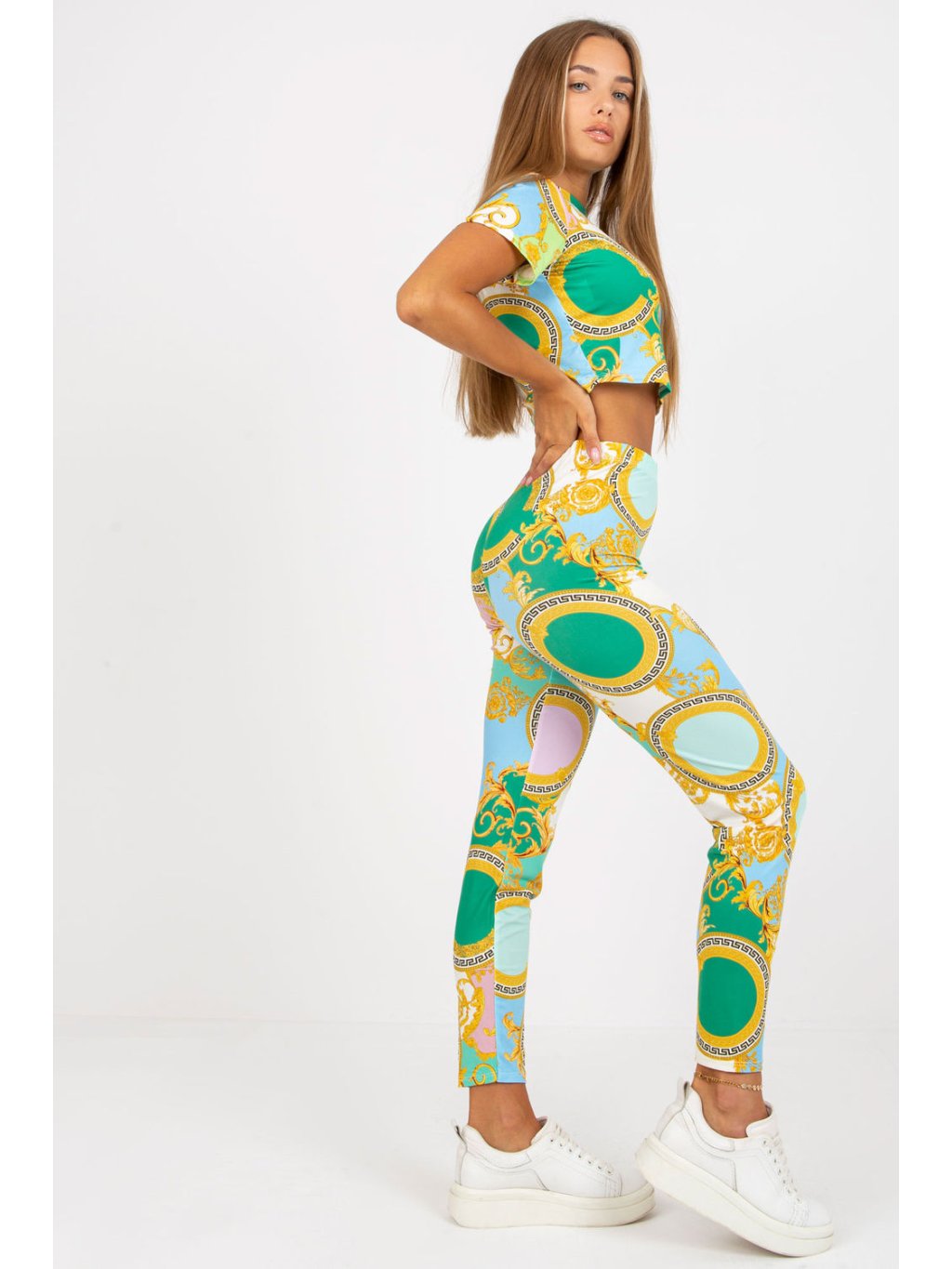 Letní souprava sestávající z trička a legín. Krátké tričko s krátkým rukávem. Legíny s vysokým pasem a zúženými nohavicemi.