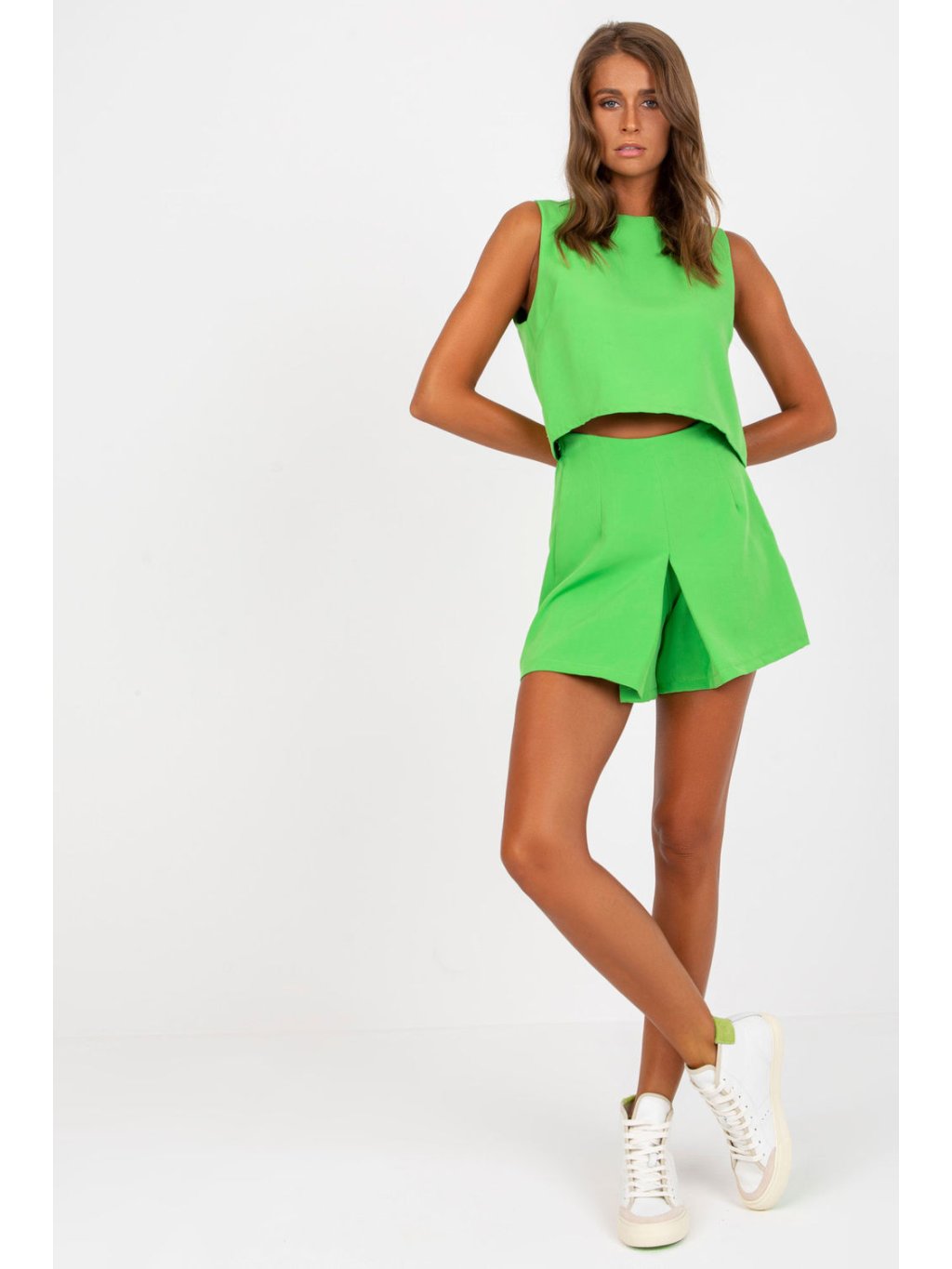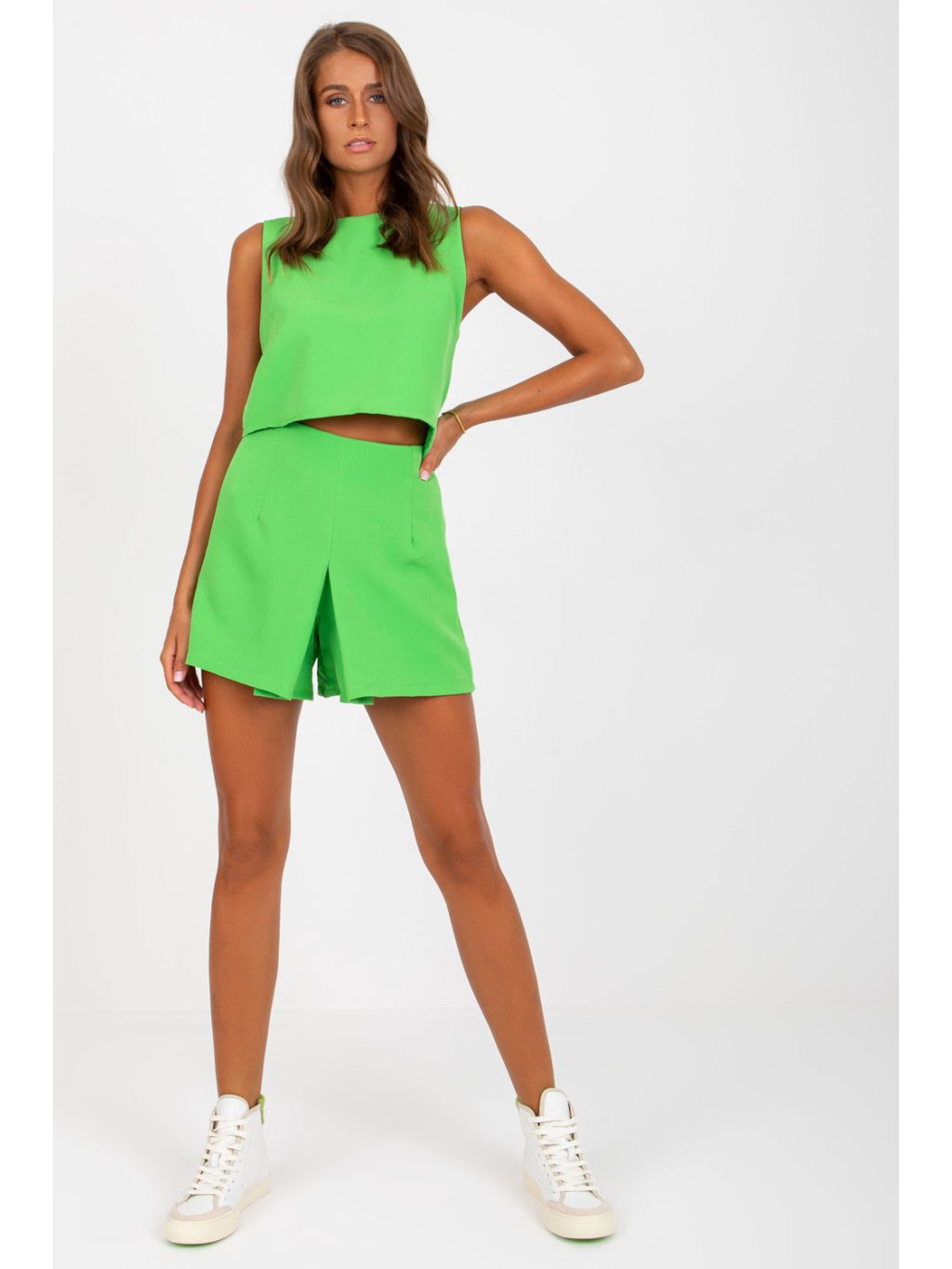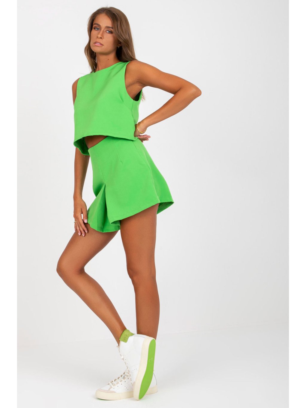 Sada se skládá z šortek a topu. Šortky s vysokým pasem, širokými nohavicemi a elastickým pasem. Top bez rukávů s ozdobným vázáním na zádech.