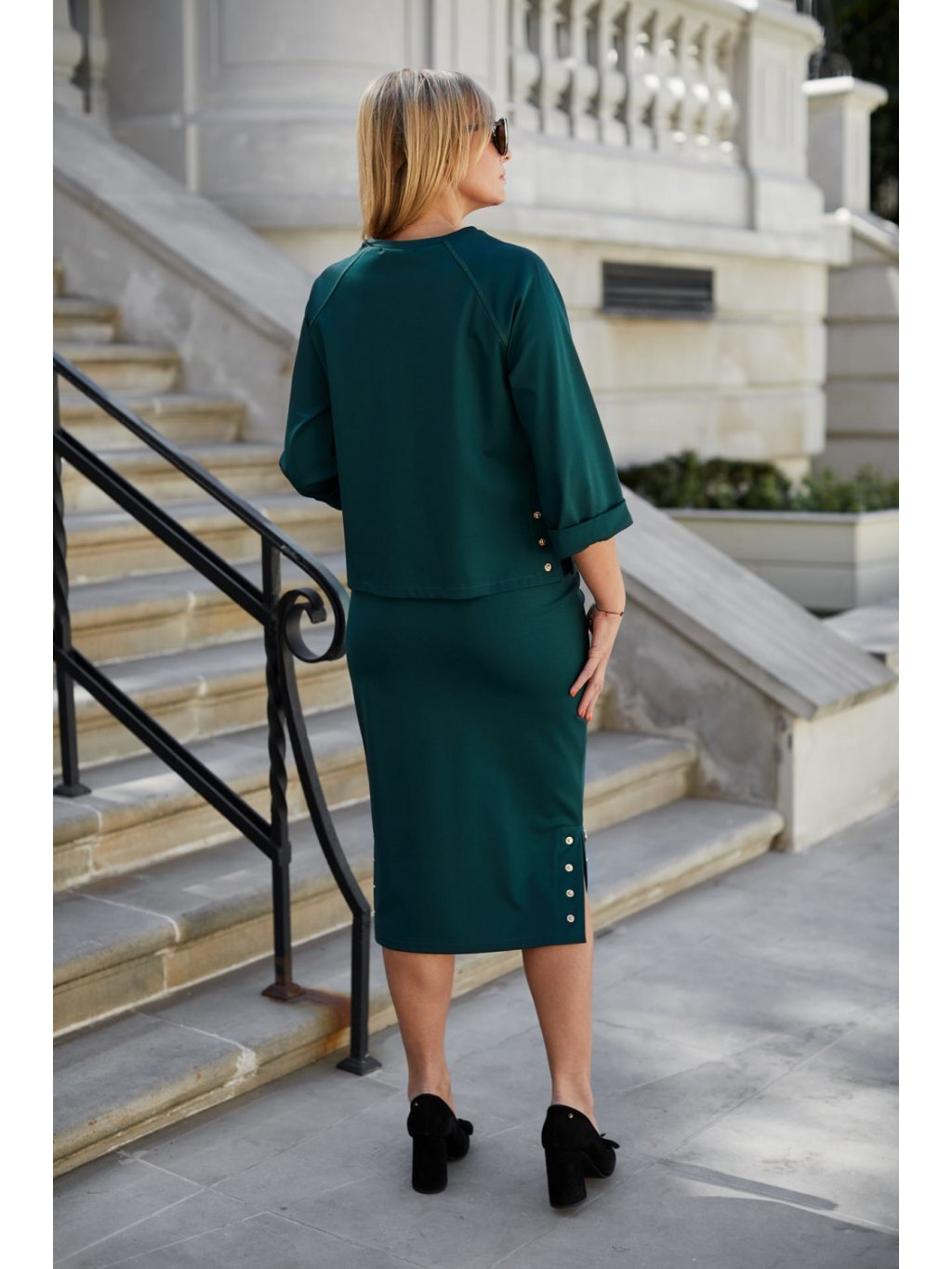 Tato dvoudílná dámská souprava si získala srdce našich zákazníků. Je celá ušitá z měkkého morgánového úpletu. Horní část má krabicový tvar s širším ohrnovacím rukávem. Mírně vypasovaná sukně ve 3/4 délce dodává módní nádech. Díky široké gumě všité do pasu se sukně dokonale přizpůsobí postavě majitelky. Celek je zdoben velkými kovovými knoflíky na horní části a na sukni. Na atraktivitě přidává také ozdobné prošití v podobě rámečku podél sukně a na spojení rukávu s halenkou. Tento promyšlený střih poskytuje pohodlí ženám všech velikostí. Bez podšívky v celé délce.
