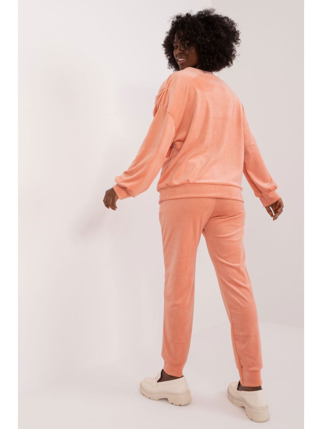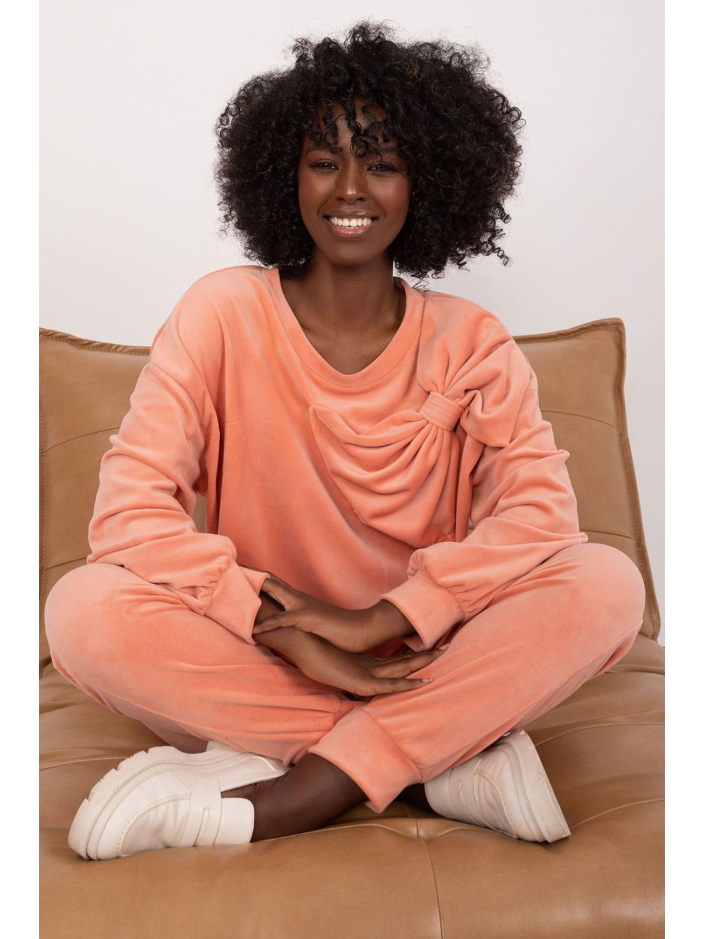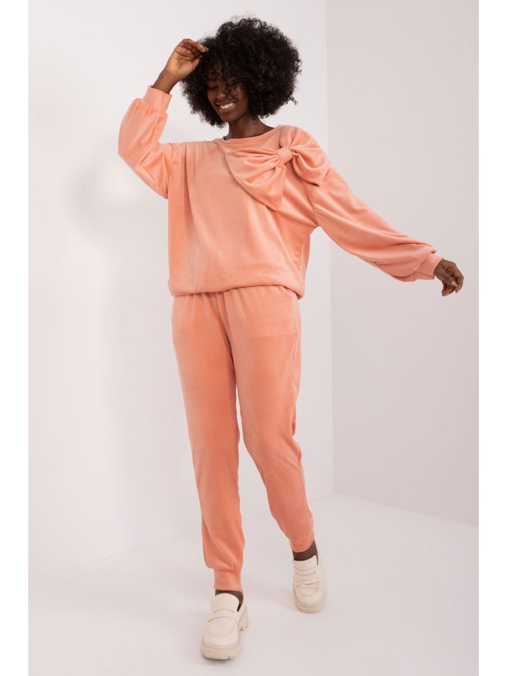 Souprava velurové mikiny a kalhot je ideální volbou pro ty, kteří ocení kombinaci pohodlí a ležérního stylu. Tato souprava, vytvořená pro každodenní aktivity, poskytuje nejen pohodlí při nošení, ale také módní vzhled. Dominantním materiálem je hladký polyester, který soupravě dodává elegantní povrch a zpříjemňuje nošení na pokožce. Díky standardní délce halenky a kalhot je souprava praktická a univerzální, ideální pro různé příležitosti. Nohavice kalhot jsou zakončeny žebrovanými lemy pro moderní, lehce sportovní vzhled. Kalhoty s vysokým pasem zdůrazňují siluetu a dodávají módní nádech. Boční kapsy na kalhotách jsou praktickým prvkem pro nošení drobných předmětů. Halenka s dlouhými rukávy a kulatým výstřihem je pohodlná a vhodná pro každodenní nošení. Dodatečný ozdobný prvek v podobě mašle na přední straně mikiny dodává soupravě jemný půvab a zvyšuje její atraktivitu. Tato souprava mikiny a kalhot kombinuje ležérní styl s moderním pohodlným střihem, takže je ideální volbou pro aktivní den plný pohodlí a módního vzhledu.