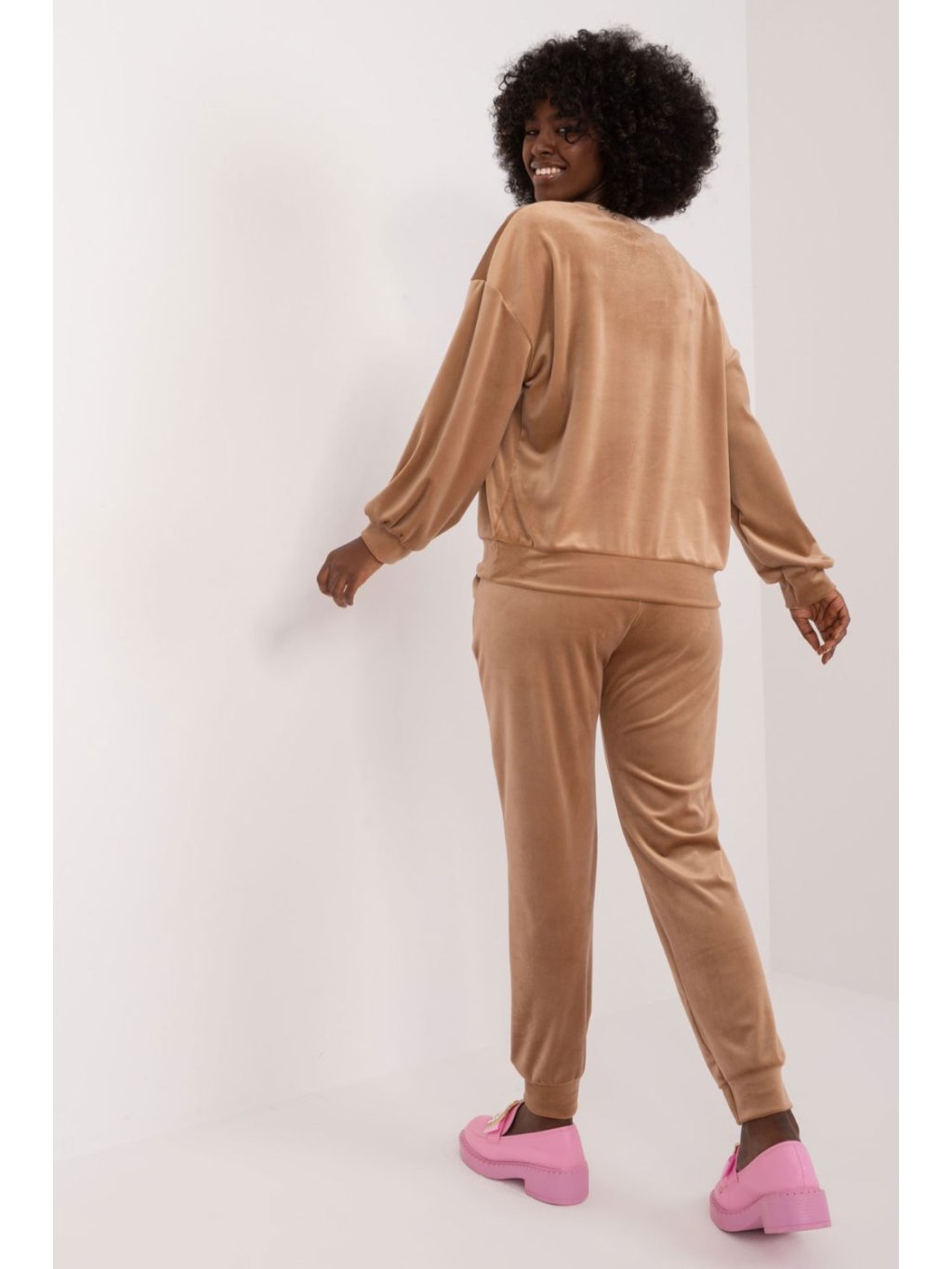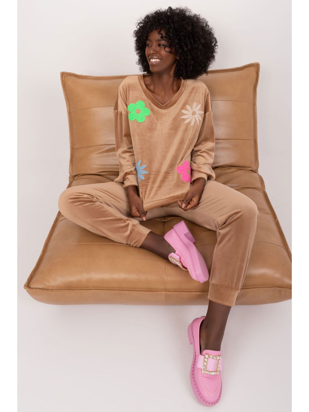 Velurová souprava, která se skládá z mikiny a kalhot, je kombinací elegance a pohodlí, ideální pro neformální chvíle odpočinku. Tato souprava, vytvořená s ohledem na pohodlí při nošení a módní vzhled, jistě upoutá pozornost svým jedinečným designem. Převažujícím materiálem je měkký polyester, který v kombinaci s velurovou úpravou poskytuje příjemný pocit na kůži. Soupravu zdobí na přední straně potisk květin, který jí dodává svěží a romantický nádech, ideální pro letní večery. Díky standardní délce halenky a kalhot je souprava praktická a univerzální. Stylizované žebrování na nohavicích kalhot dodává moderní, sportovní vzhled a zároveň umožňuje volnost pohybu. Kalhoty s vysokým pasem zvýrazňují pas, zatímco boční nakládané kapsy na kalhotách jsou praktické a stylové zároveň. Mikina s dlouhými rukávy a kulatým výstřihem je pohodlná a vhodná pro každodenní nošení. Celek vytváří harmonický obraz, v němž se snoubí elegance a ležérnost. Velurová souprava s květinovým potiskem je ideální volbou pro milovníky ležérního stylu s nádechem romantiky.