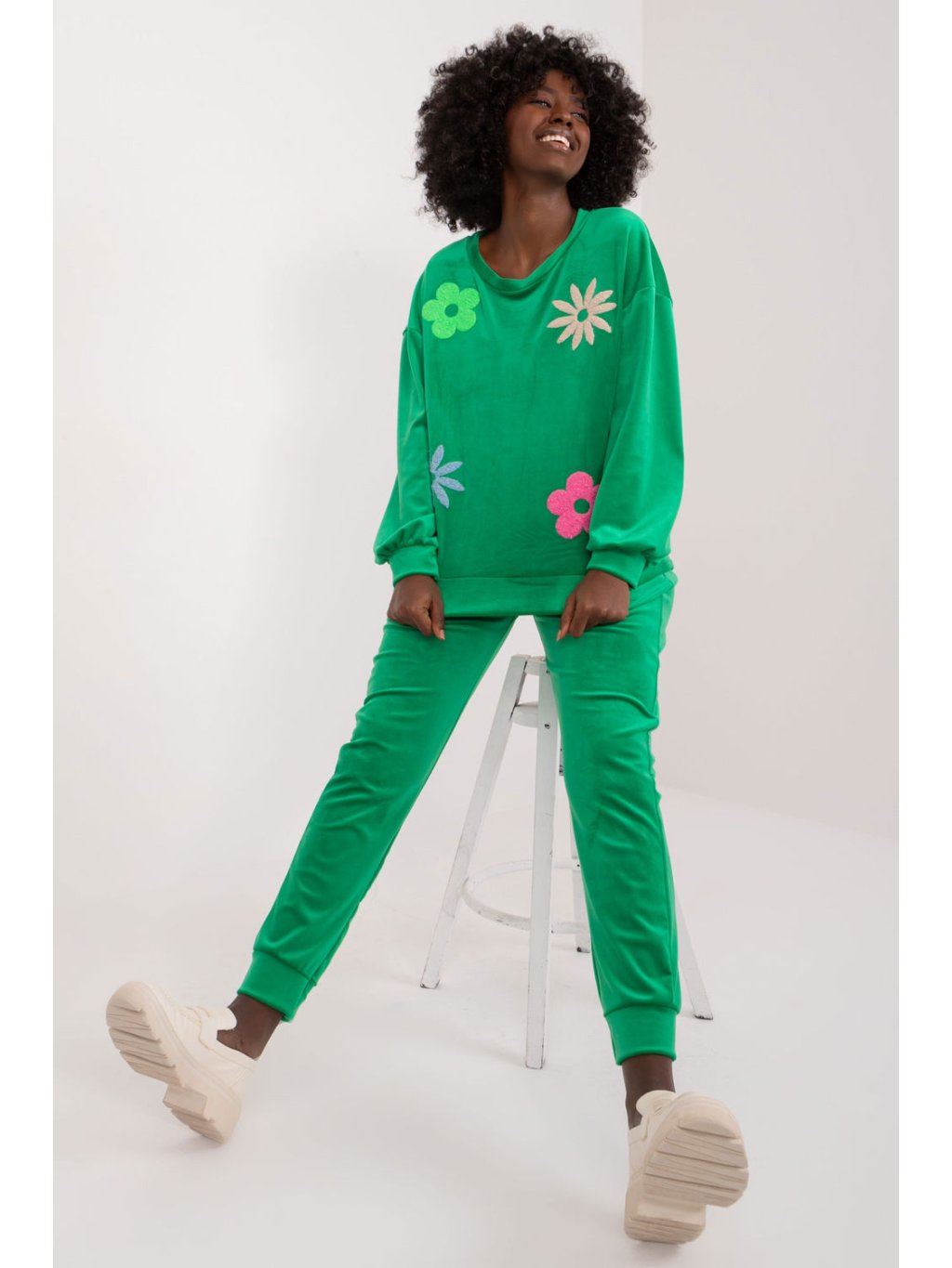 Velurová souprava, která se skládá z mikiny a kalhot, je kombinací elegance a pohodlí, ideální pro neformální chvíle odpočinku. Tato souprava, vytvořená s ohledem na pohodlí při nošení a módní vzhled, jistě upoutá pozornost svým jedinečným designem. Převažujícím materiálem je měkký polyester, který v kombinaci s velurovou úpravou poskytuje příjemný pocit na kůži. Soupravu zdobí na přední straně potisk květin, který jí dodává svěží a romantický nádech, ideální pro letní večery. Díky standardní délce halenky a kalhot je souprava praktická a univerzální. Stylizované žebrování na nohavicích kalhot dodává moderní, sportovní vzhled a zároveň umožňuje volnost pohybu. Kalhoty s vysokým pasem zvýrazňují pas, zatímco boční nakládané kapsy na kalhotách jsou praktické a stylové zároveň. Mikina s dlouhými rukávy a kulatým výstřihem je pohodlná a vhodná pro každodenní nošení. Celek vytváří harmonický obraz, v němž se snoubí elegance a ležérnost. Velurová souprava s květinovým potiskem je ideální volbou pro milovníky ležérního stylu s nádechem romantiky.