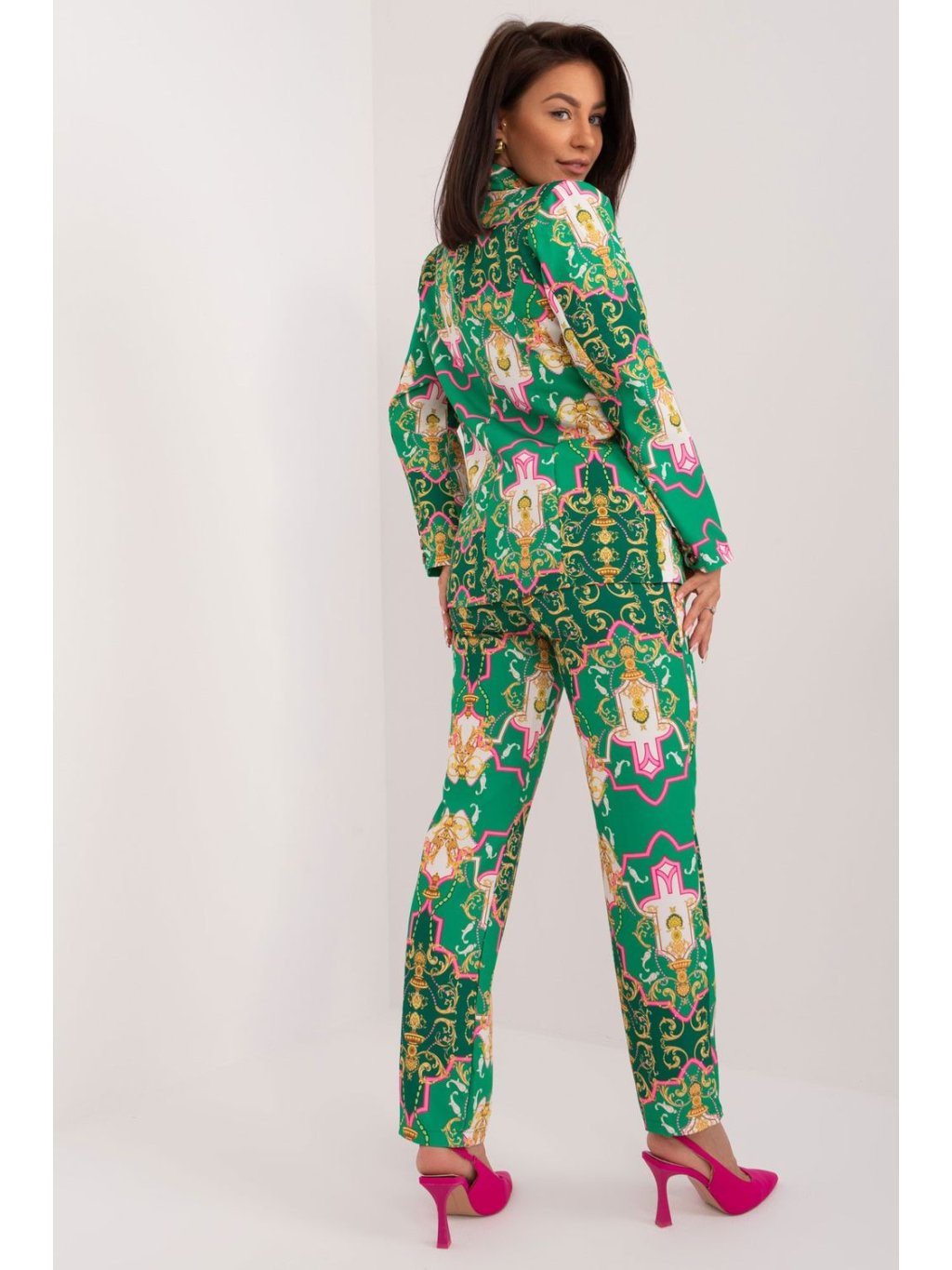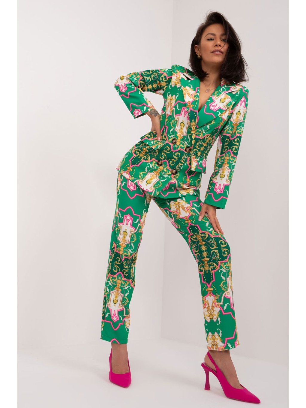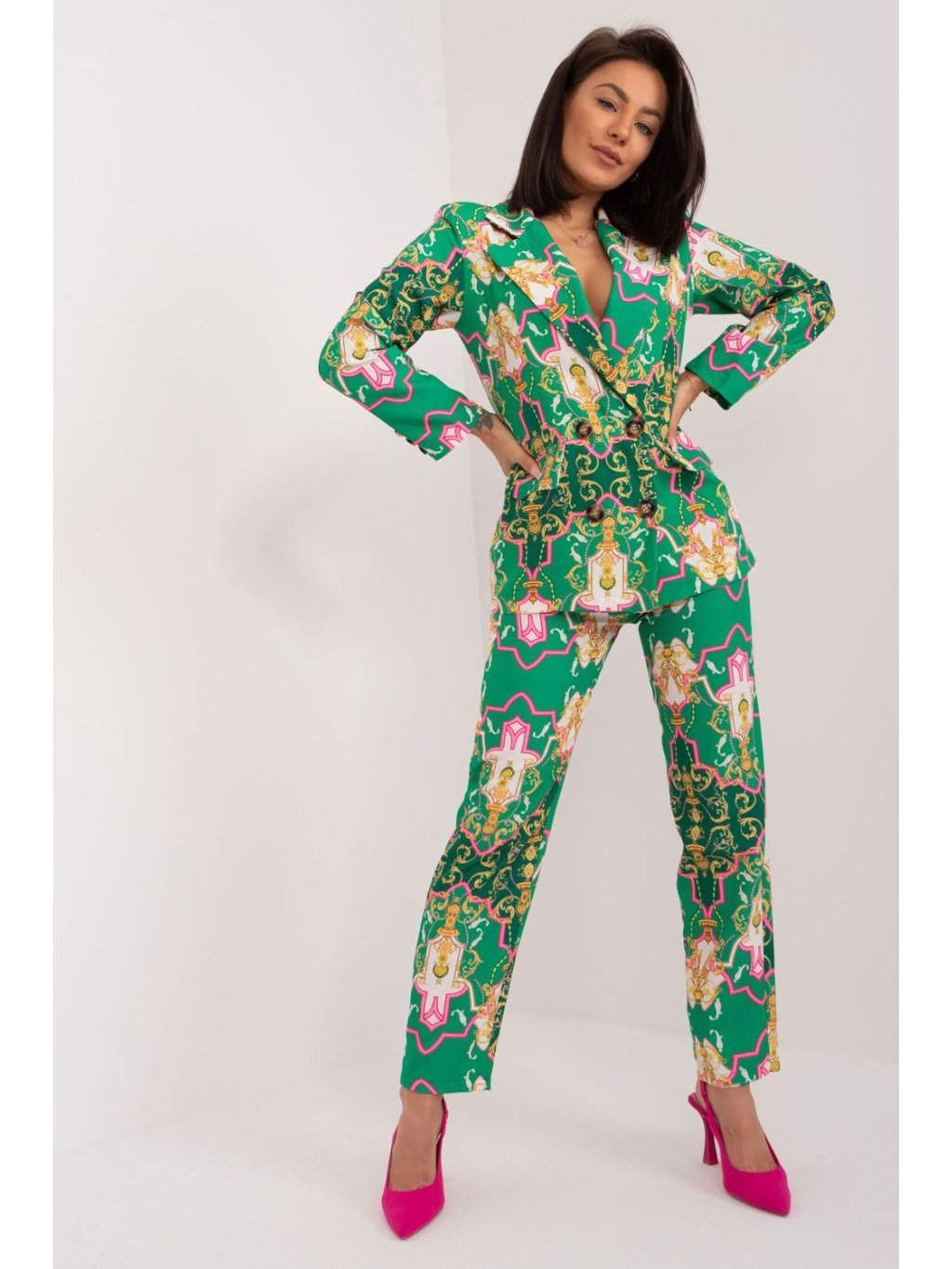 Tato elegantní dámská souprava je ideální pro různé příležitosti, od každodenního nošení v práci až po účast na večírku nebo obchodní schůzce. Skládá se ze saka s dlouhými rukávy a dlouhých kalhot se zapínáním na zip a knoflík. Sako je vyrobeno z vysoce kvalitního materiálu, který zaručuje eleganci a pohodlí při nošení. Zapíná se na knoflíky a klopy mu dodávají klasický nádech. Sako s podšívkou poskytuje pohodlí a lépe padne. Kalhoty mají rovné nohavice a vysoký pas, takže jsou nejen stylové, ale také pohodlné a dobře padnoucí. Zapínání na zip a knoflík zajišťuje snadné oblékání a odolnost. Soupravu zdobí potisk, který jí dodává originalitu a charakter. Díky standardní délce a rovným nohavicím ji lze snadno kombinovat s různými kousky oblečení a vytvářet tak různé styly. Jako bonus jsou na kalhotách praktické postranní kapsy, které dodávají této soupravě utilitární nádech. Díky kvalitnímu zpracování a elegantnímu designu bude tato dámská souprava jistě skvělou volbou pro mnoho různých příležitostí.
