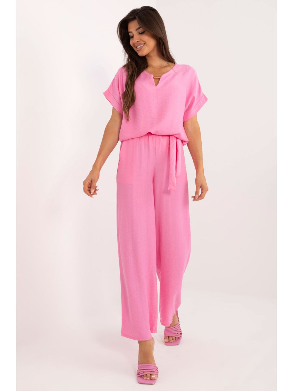 Tento ležérní komplet složený z halenky a kalhot je ideální volbou pro každodenní nošení i do práce. Je vyrobena z převažující viskózy a poskytuje pohodlí a prodyšnost po celý den. Hladký materiál v jednobarevném provedení dodává soupravě elegantní a zároveň ležérní vzhled. Halenka s krátkými rukávy a kulatým výstřihem se skvěle kombinuje s dlouhými kalhotami se širokými nohavicemi. Kalhoty s vysokým pasem zdůrazňují pas a pásek na zavázání dodává stylový nádech. Praktické postranní kapsy s patkou zvyšují funkčnost. Jedná se o všestranný komplet, který se skvěle hodí do kanceláře i na každodenní nošení.