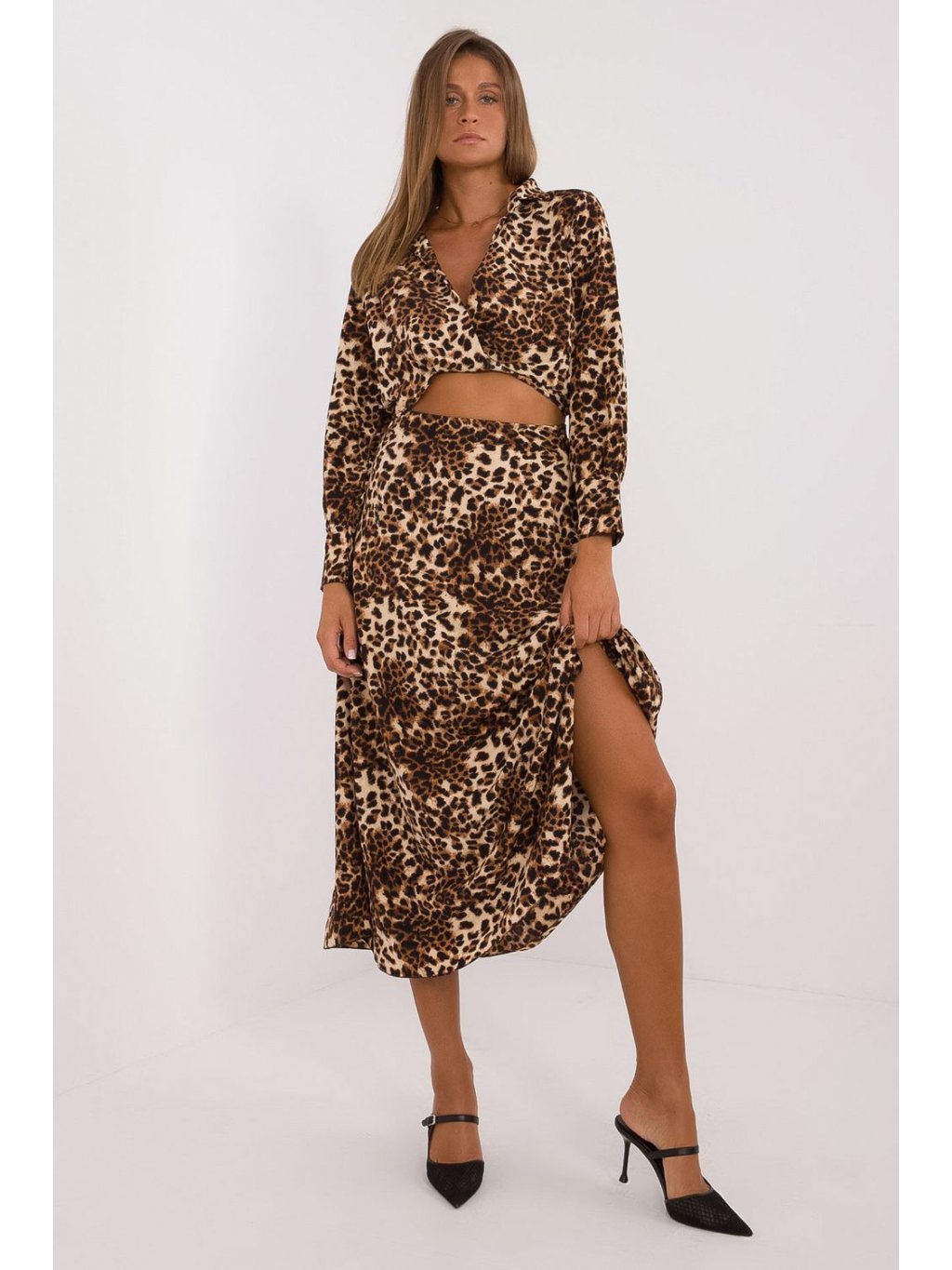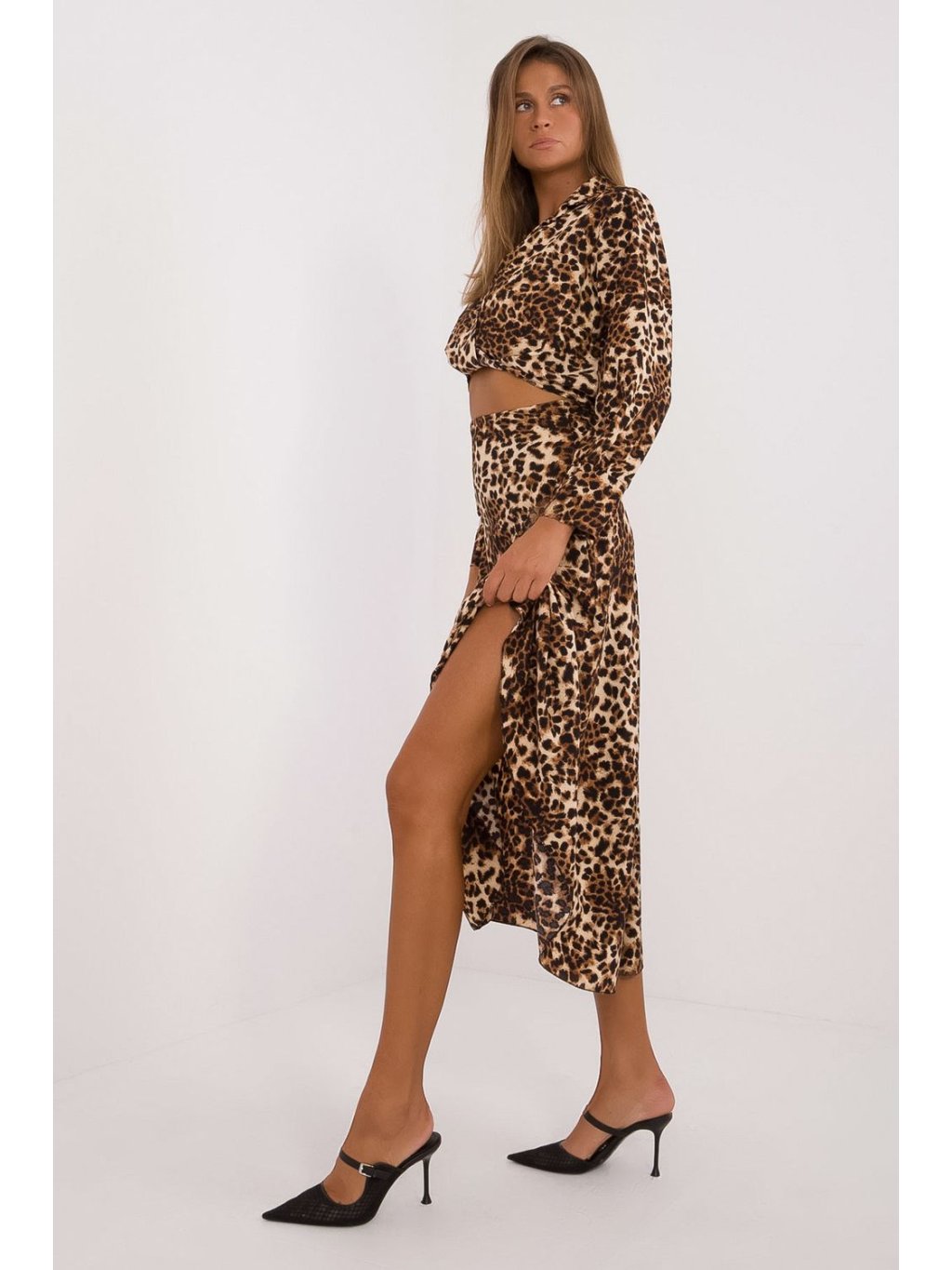 Modelka má na sobě velikost one size. Rozměry modelky: výška 176 cm, hrudník 85 cm, pas 64 cm, boky 92 cm. Rozměry kompletního setu v velikosti one size měřené na plocho: šířka blůzky pod pažemi - 51 cm, délka blůzky - 40 cm, délka rukávu - 55 cm, šířka sukně v pasu - 38 cm, délka sukně - 91 cm.