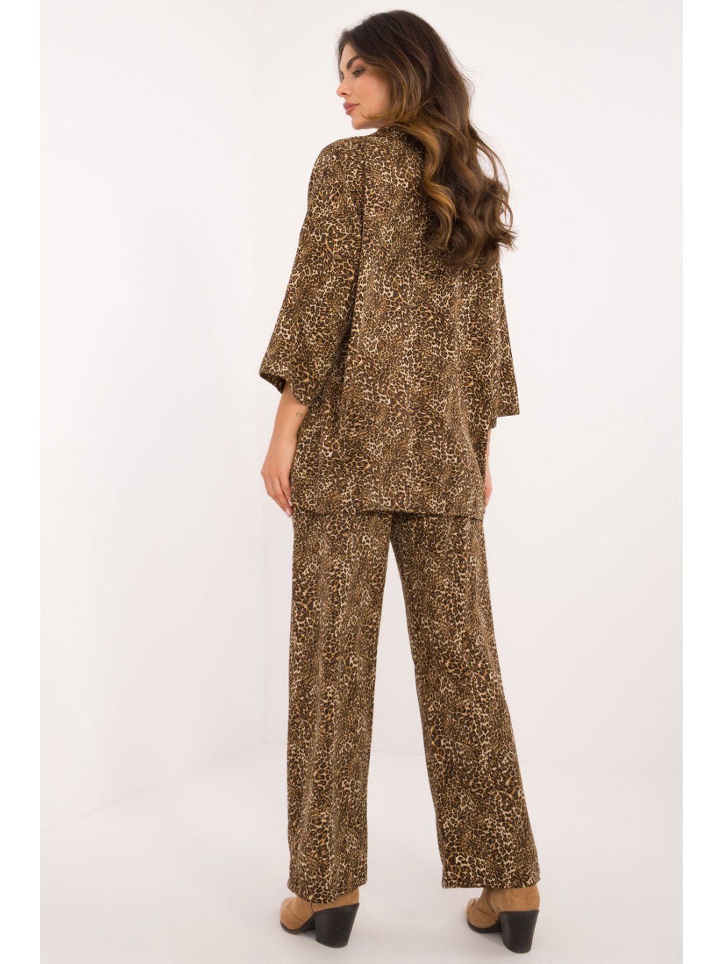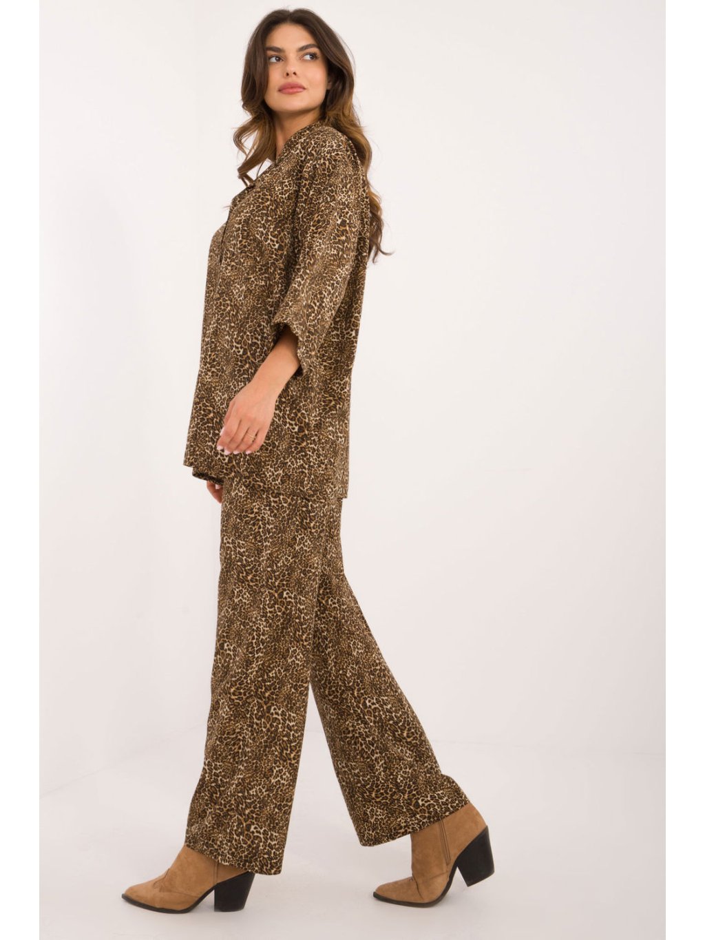 Sada skládající se z košile a kalhot, ideální na každodenní příležitosti v casual stylu. Košile se zapíná na knoflíky, s rukávy délky 3/4 a klasickým límcem, co jí dodává univerzální charakter. Další výhodou je praktická kapsa na výšce hrudníku. Kalhoty mají široké nohavice, co zajišťuje pohodlí a volnost pohybu, a díky elastické gumě v pasu se dokonale přizpůsobují siluetě a nabízejí pohodlí nošení po celý den. Sada je vyrobena z kombinace polyesteru a elastanu, co zaručuje lehkost, pružnost a odolnost materiálu. Dominantním motivem je zvířecí motiv, který dodává celku módní a výrazný akcent. Košile a kalhoty jsou dlouhé a kalhoty mají vysoký pas, co zdůrazňuje siluetu a dodává eleganci v každodenních stylizacích.
