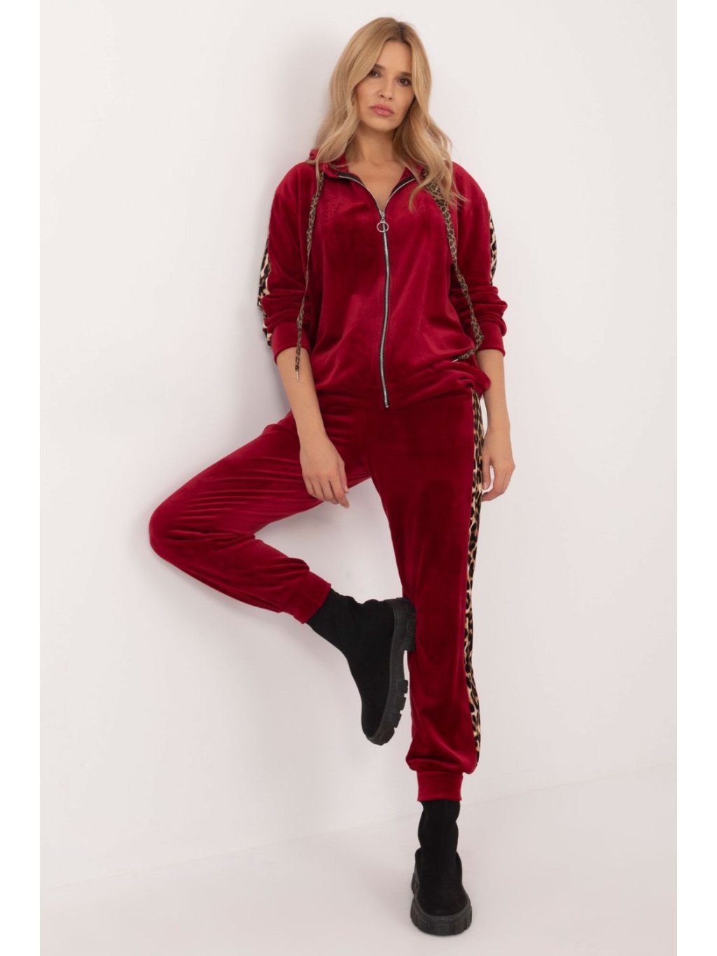 Dámská velurová souprava sestávající z mikiny a kalhot, ideální pro každodenní příležitostné nošení. Je vyrobena ze směsi viskózy a elastanu příjemné na dotek a poskytuje pohodlí a volnost pohybu. Mikina na zip s dlouhými rukávy a kapucí je pohodlná a praktická, zatímco lemování se zvířecím vzorem na rukávech dodává módní a dynamický nádech. Kalhoty s vysokým pasem, zavazované v pase, dokonale padnou postavě a praktickým doplňkem jsou vsazené boční kapsy. Dlouhé nohavice s žebrovanými lemy poskytují pohodlí a sportovní vzhled, zatímco lemování se zvířecím vzorem na nohavicích dodává styl a originalitu. Tato souprava je dokonalou kombinací funkčnosti a módního designu, ideální pro každodenní nošení.