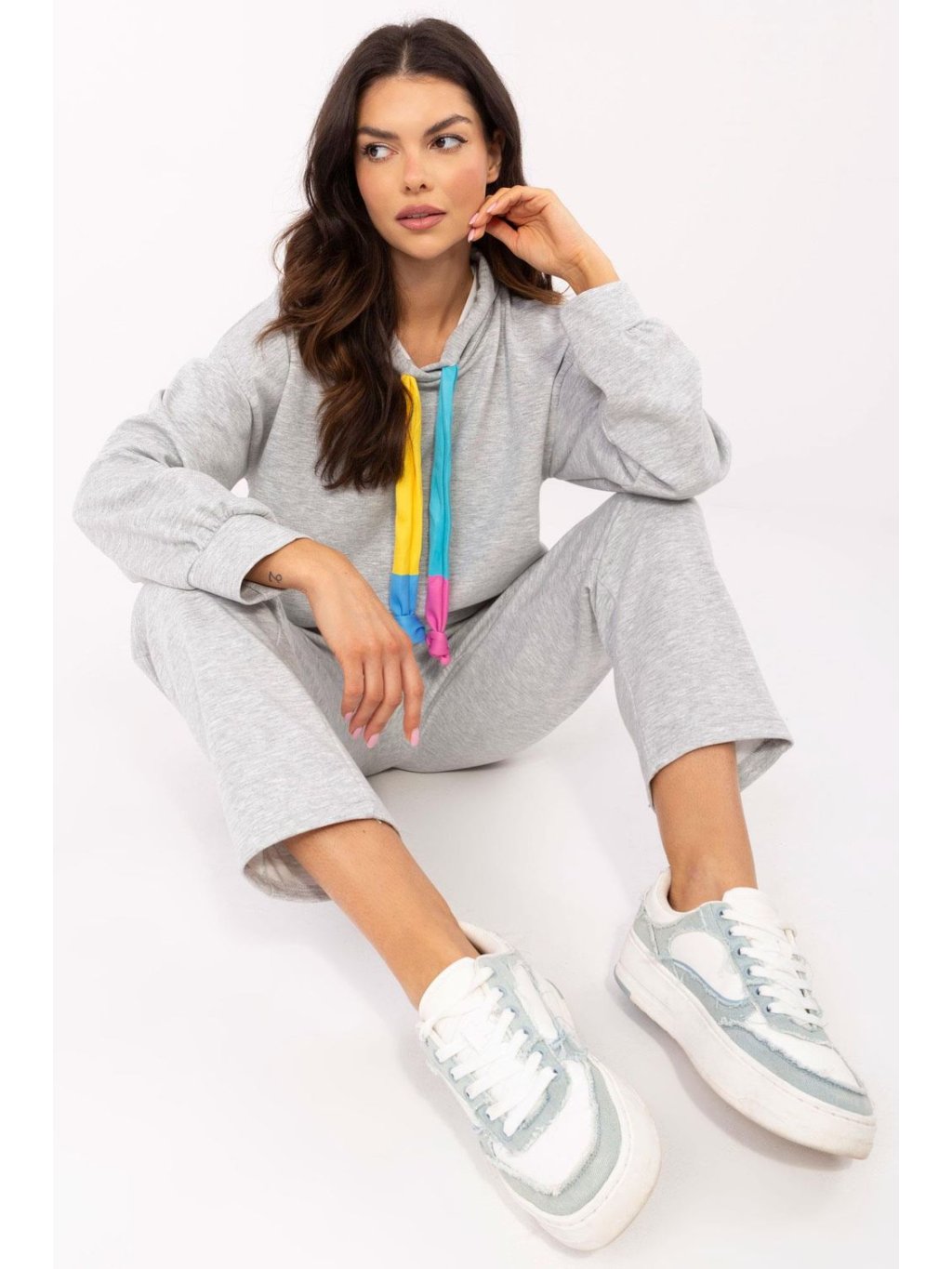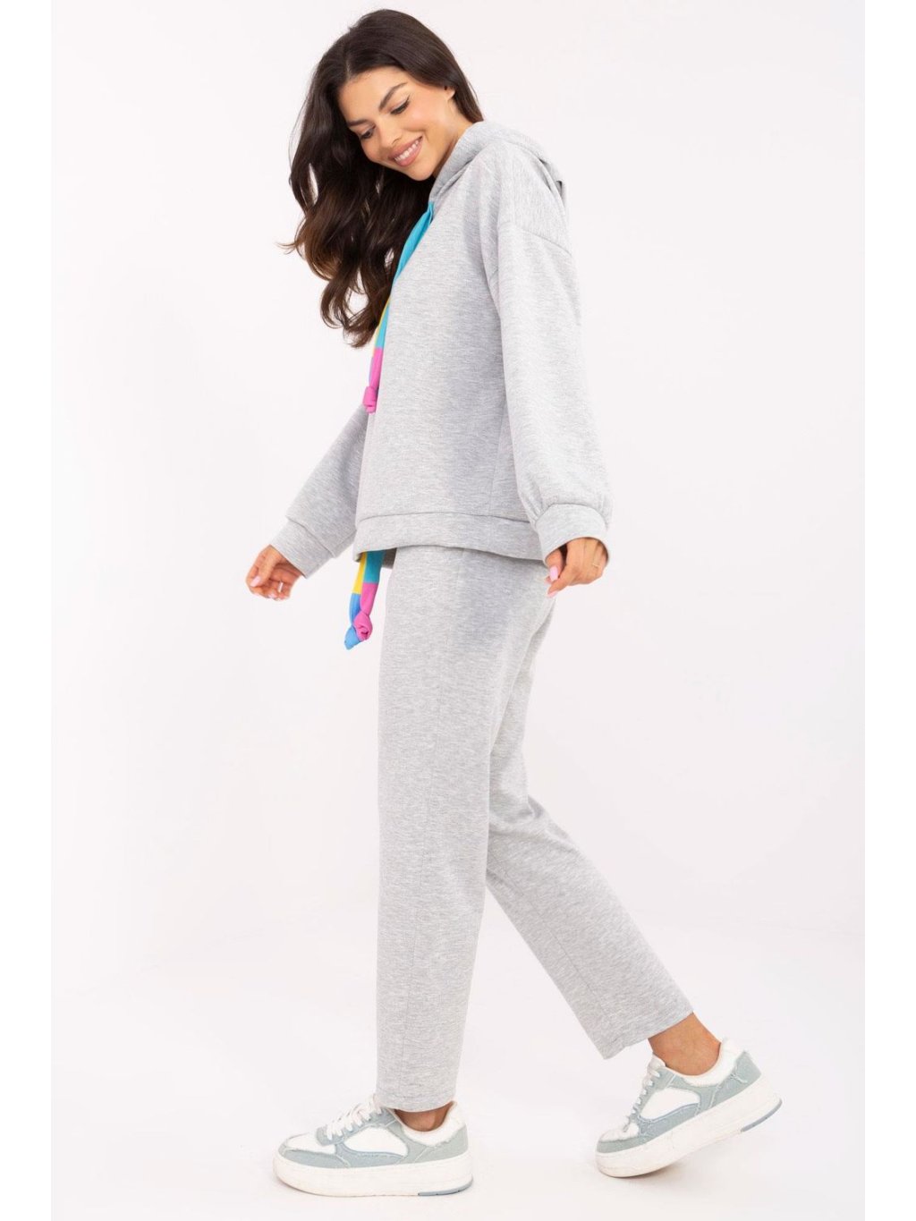 Sada oblečení ve volném stylu je ideální volbou na každý den, spojující pohodlí a módní vzhled. Vyrobená z vysoce kvalitní směsi polyesteru, viskózy a elastanu poskytuje pohodlí nošení a volnost pohybů. Mikina s dlouhým rukávem má praktickou kapuci s šňůrkami k regulaci, co dodává sportovní charakter. Kalhoty s přímým střihem a dlouhými nohavicemi mají vysoký pas a vsazené boční kapsy, a dodatečná šňůra v pasu umožňuje ideální přizpůsobení. Melanžový šedý vzor činí sadu univerzální a skvěle se kombinuje s různými doplňky. Jedná se o skvělou volbu pro každodenní stylizace na procházky, nákupy i odpočinek v domácím útulku.