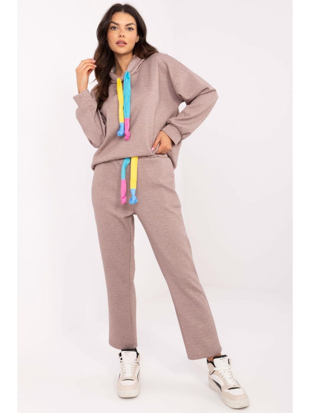 Sada oblečení ve volném stylu je ideální volbou na každý den, kombinující pohodlí a stylový vzhled. Vyrobená z vysoké kvality směsi polyesteru, viskózy a elastanu, poskytuje pohodlí a volnost pohybu. Mikina s dlouhým rukávem má praktickou kapuci s šňůrkami k nastavení, co dodává sportovní charakter. Kalhoty s rovným střihem a dlouhými nohavicemi mají vysoký pas a boční kapsy, a dodatečná šňůrka v pase umožňuje ideální přizpůsobení. Melanžový šedý vzor dělá sadu univerzální a skvěle se kombinuje s různými doplňky. Je to skvělá volba pro každodenní stylizace jak na procházku, nákupy, tak i odpočinek v domácím útulku.