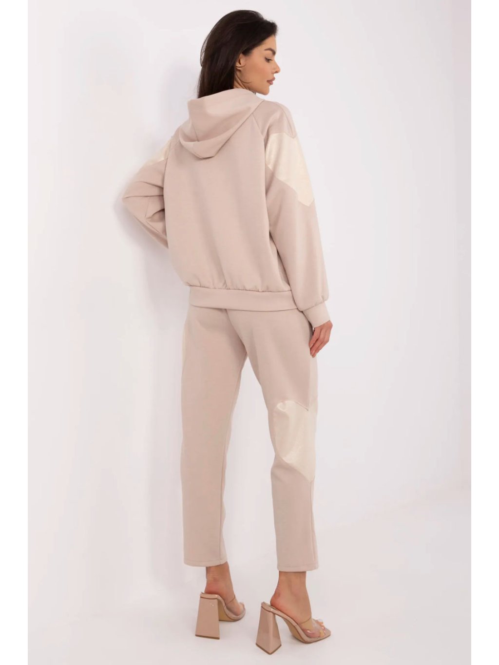 Dámský teplákový set je ideální kombinací pohodlí a stylu na každý den. Skládá se z mikiny s kapucí a kalhot s vysokým pasem, které se skvěle přizpůsobují postavě. V pasu je praktické šňůrkování, umožňující regulaci obvodu. Jak mikina, tak kalhoty mají jednoduchý, minimalistický střih, který se hodí do každodenních outfitů. Dlouhé nohavice a rukávy zajišťují pohodlí nošení a boční kapsy přidávají funkcionalitu. Materiál z polyesteru, bavlny a elastanu je měkký, příjemný na dotek a dobře padne na tělo. Hladký vzor doplňují jemné nášivky ve tvaru srdce umístěné na rukávech a nohavicích, dodávajíc celku výjimečný charakter. Je to skvělá volba na každodenní aktivity, relaxaci doma nebo procházku.