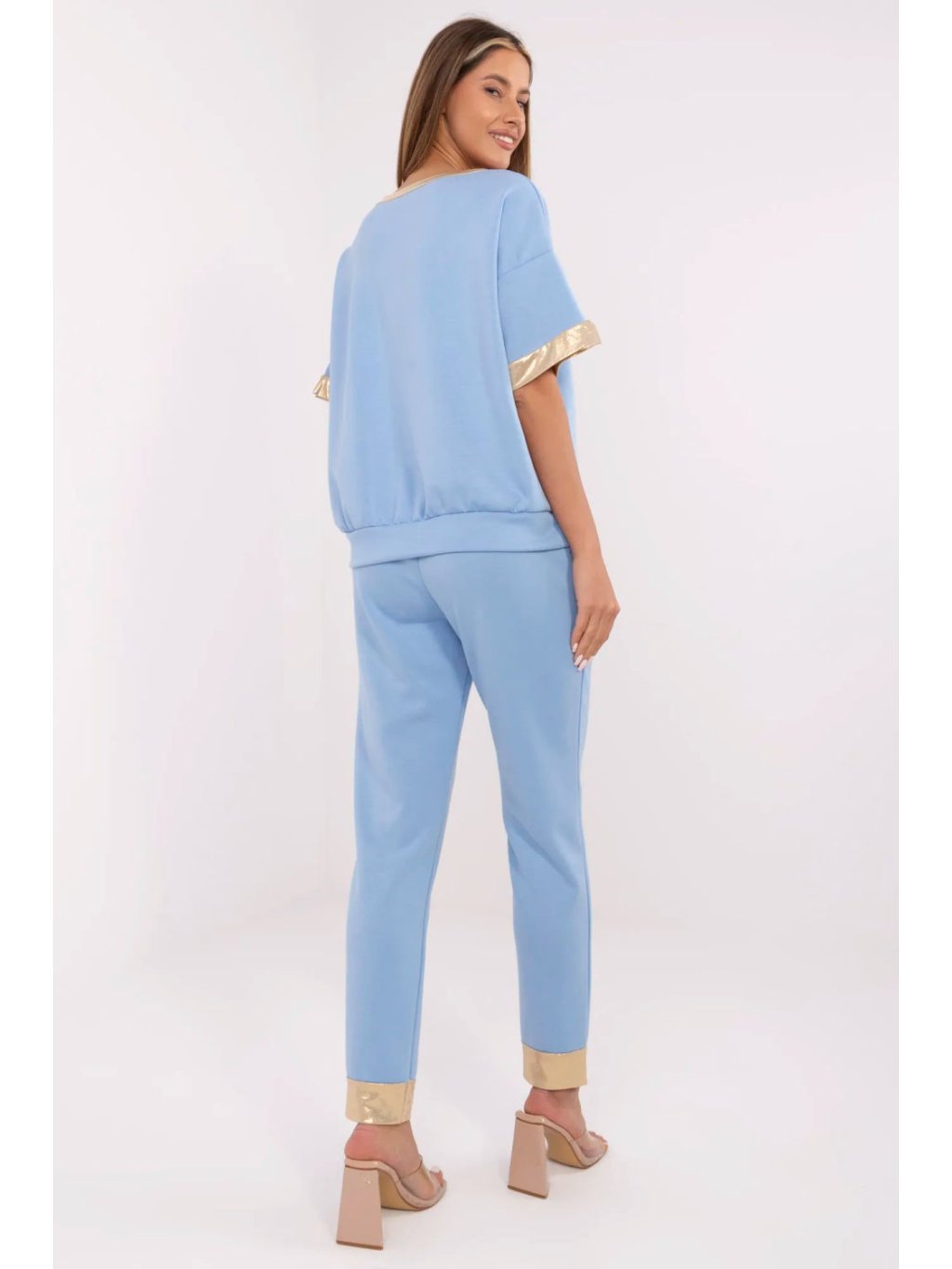 Elegantní a pohodlný dámský set, ideální na každý den. Vyrobený z vysoce kvalitní směsi viskózy, bavlny a elastanu, poskytuje pohodlné nošení a volnost pohybu. Hladký materiál mu dodává elegantní minimalismus a zlaté detaily na nohavicích, rukávech a výstřihu přidávají decentní eleganci. Halenka má krátký rukáv a klasický kulatý výstřih, zatímco kalhoty s vysokým pasem a bočními kapsami zajišťují pohodlí a praktičnost. Dlouhé nohavice s pružnými lemy zdůrazňují ležérní charakter setu. Ideální volba pro ženy ocení styl a pohodlí v každodenních outfitů.