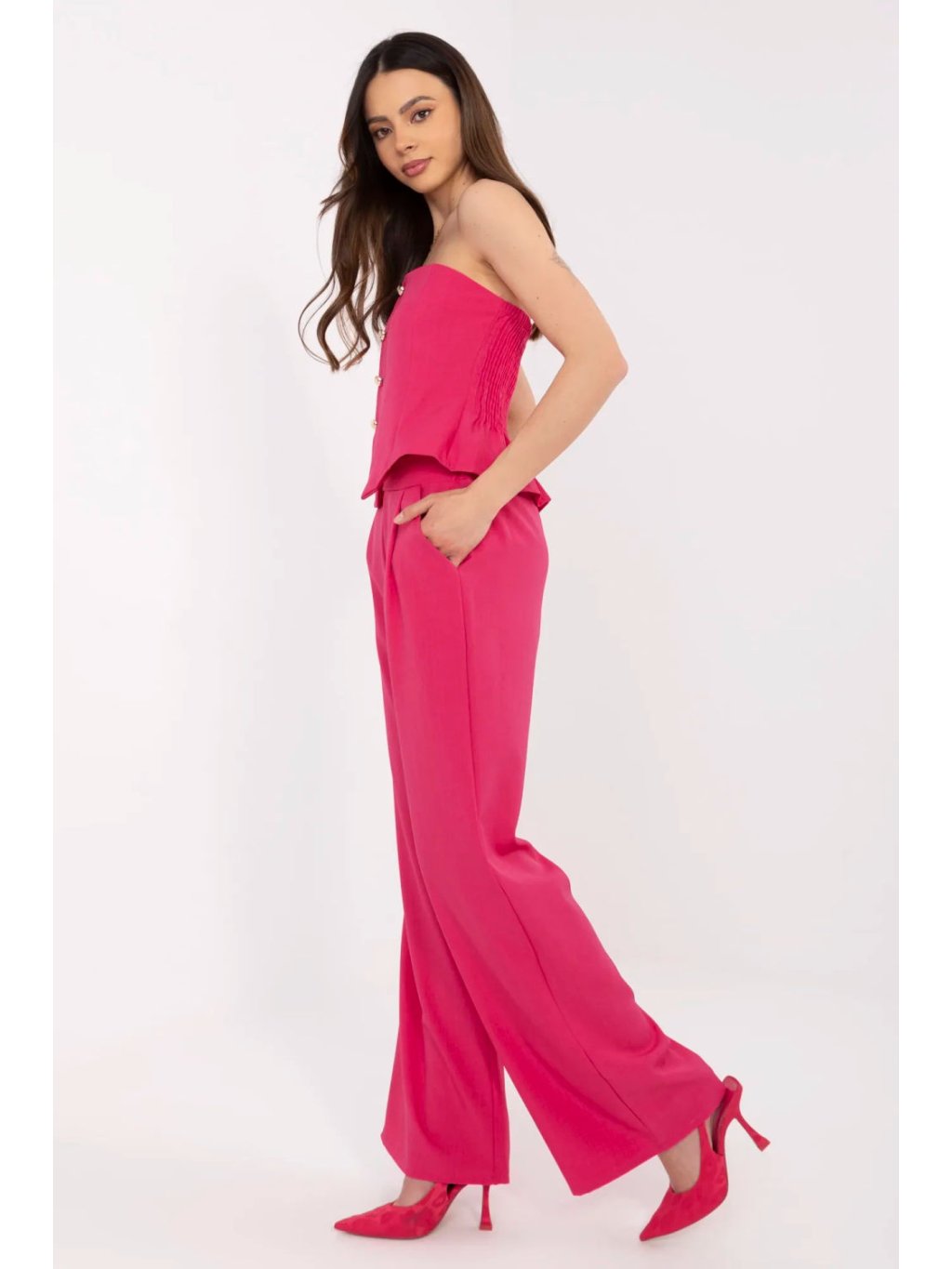Stylový dámský komplet skládající se z vesty a kalhot je vynikající volba pro ženy, které si cení elegance s nádechem modernosti. Ideální na každodenní nošení, do práce, na společenské příležitosti nebo večírky, se osvědčí všude tam, kde záleží na stylu a pohodlí. Vesta bez rukávů s španělským výstřihem je zdobena dekorativními knoflíky vpředu a efektními nabíráním na zádech, které dodávají siluetě jemnou lehkost a zvýrazňují ženské linie. Kalhoty s vysokým pasem a širokými nohavicemi opticky prodlužují nohy a krásně se usazují v pohybu. Vkládané boční kapsy jim dodávají funkčnost, aniž by narušovaly elegantní charakter soupravy. Vyrobený z hladkého materiálu, kombinace polyesteru a elastanu, komplet zaručuje pohodlí a styl po celý den.