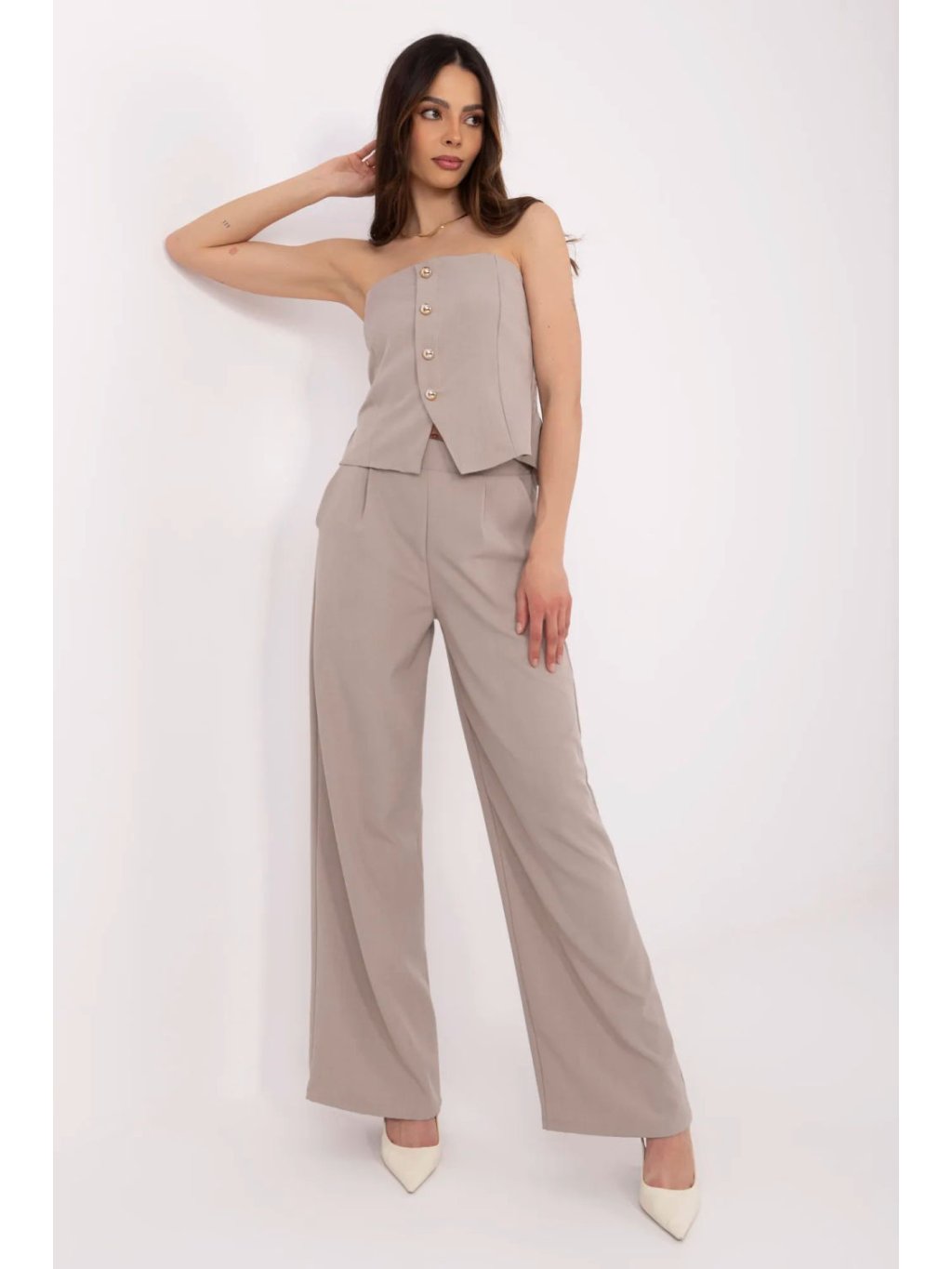 Stylový dámský komplet skládající se z vesty a kalhot je skvělou volbou pro ženy, které si cení elegance s nádechem modernosti. Ideální na každý den, do práce, na návštěvy nebo akce, bude se hodit všude tam, kde záleží na stylu a pohodlí. Vesta bez rukávů s španělským výstřihem je zdobena dekoračními knoflíky vpředu a efektními nařasenými detaily na zádech, které dodávají siluetě jemnou lehkost a zdůrazňují ženskou linii. Kalhoty s vysokým pasem a širokými nohavicemi opticky prodlužují nohy a krásně se pohybují. Vložkové boční kapsy jim dodávají funkčnost, aniž by narušovaly elegantní charakter celého setu. Vyrobený z hladkého materiálu, kombinace polyesteru a elastanu, zajišťuje komplet pohodlí a styl po celý den.