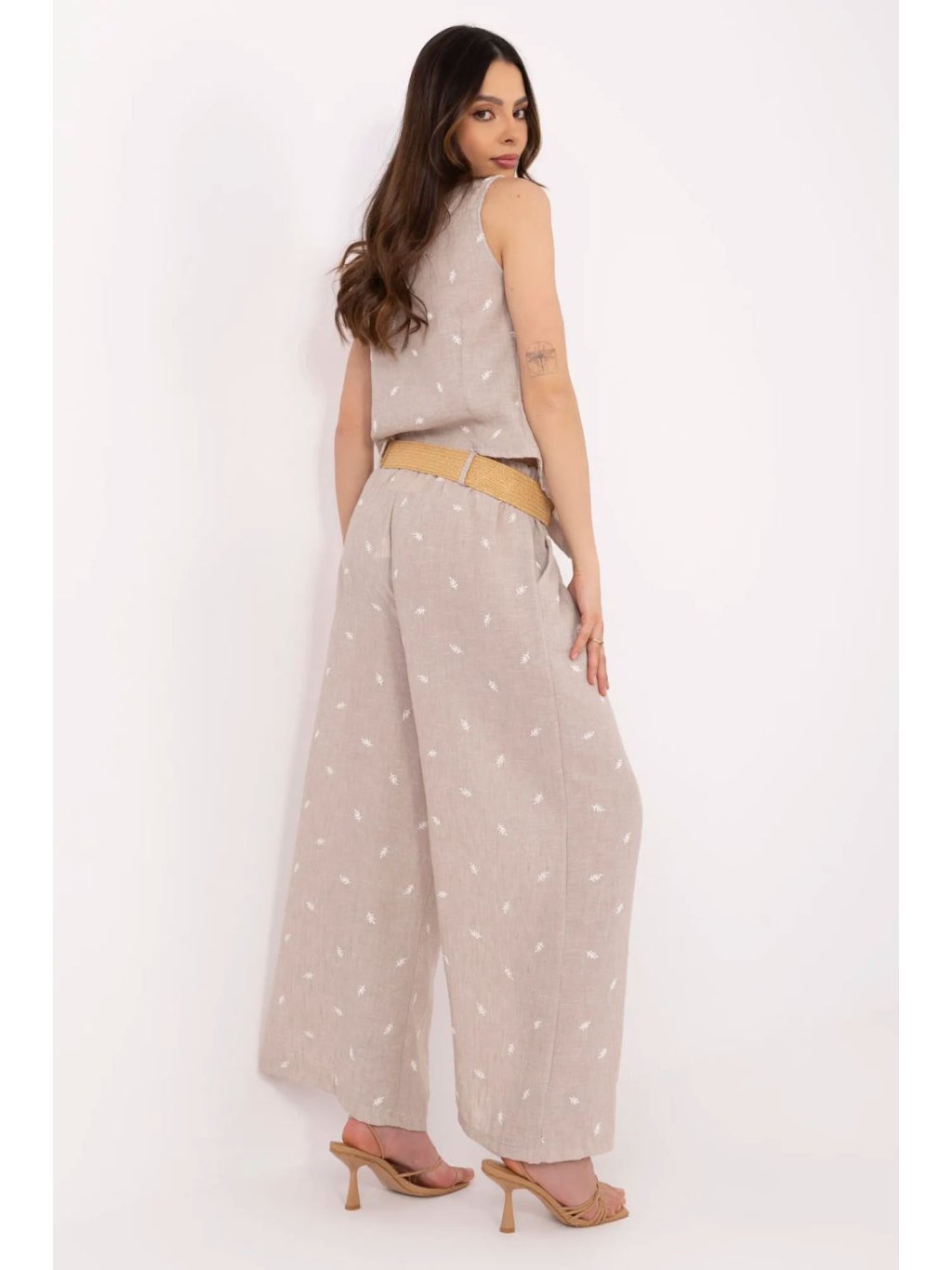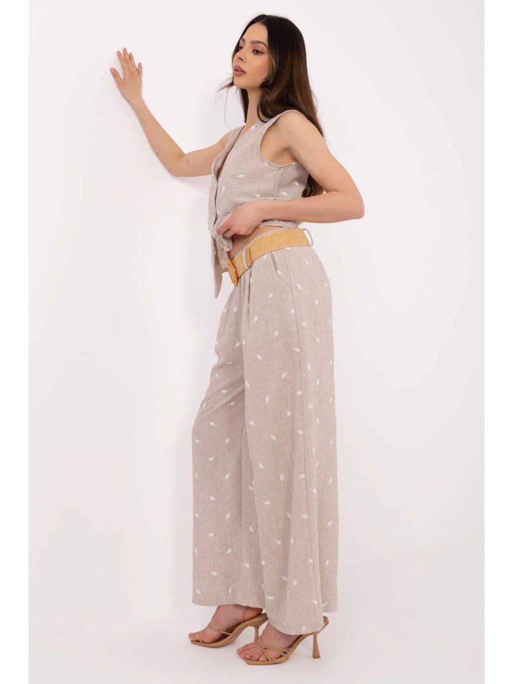 Stylový dámský komplet v casualním provedení, který se skvěle hodí jak na každodenní nošení, tak do práce. Skládá se z přiléhavé vesty a kalhot s širokými nohavicemi, čímž vytváří módní a pohodlný celek s jemným, elegantním akcentem. Vesta bez rukávů zapínaná na knoflíky má klasický výstřih do V, který krásně zvýrazňuje linii krku. Obohacena o dekorativní výšivku a pásek na vázání v pase, skvěle modeluje siluetu a dodává stylingu originalitu. Kalhoty s vysokým pasem a širokými nohavicemi opticky prodlužují nohy, a vsunuté boční kapsy zajišťují praktičnost bez opuštění elegantního vzhledu. Vyrobený z elastického materiálu, kombinace polyesteru a elastanu, komplet zaručuje pohodlí nošení po celý den, přičemž zachovává módní, promyšlený vzhled.