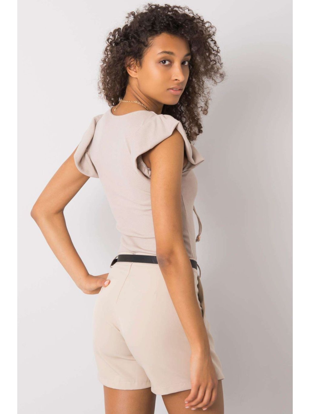 Halenka s krátkými rukávy v podobě volánku z žebrované tkaniny. Sýrový výstřih s ozdobným lemováním.Velikost | Celková délka | Obvod prsou |