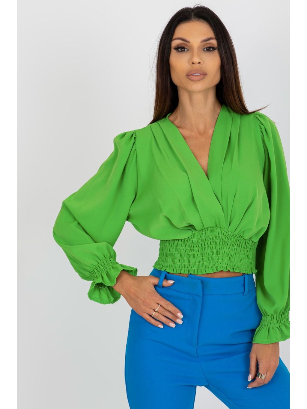 Halenka s obálkovým výstřihem a dlouhými rukávy. Široká podpůrná guma ve spodní části halenky.