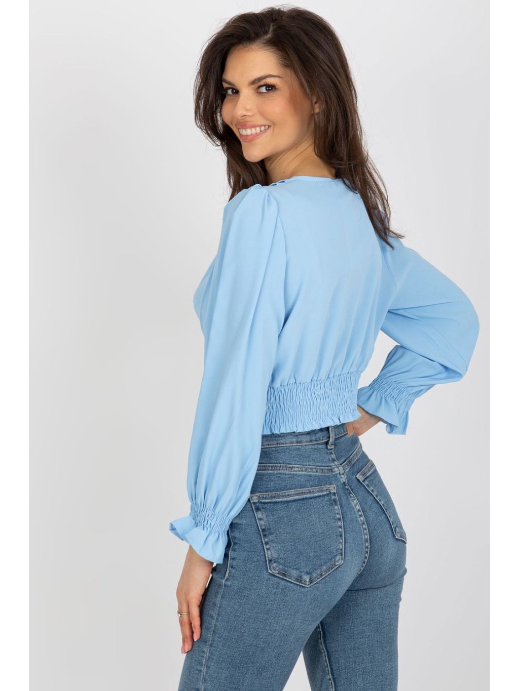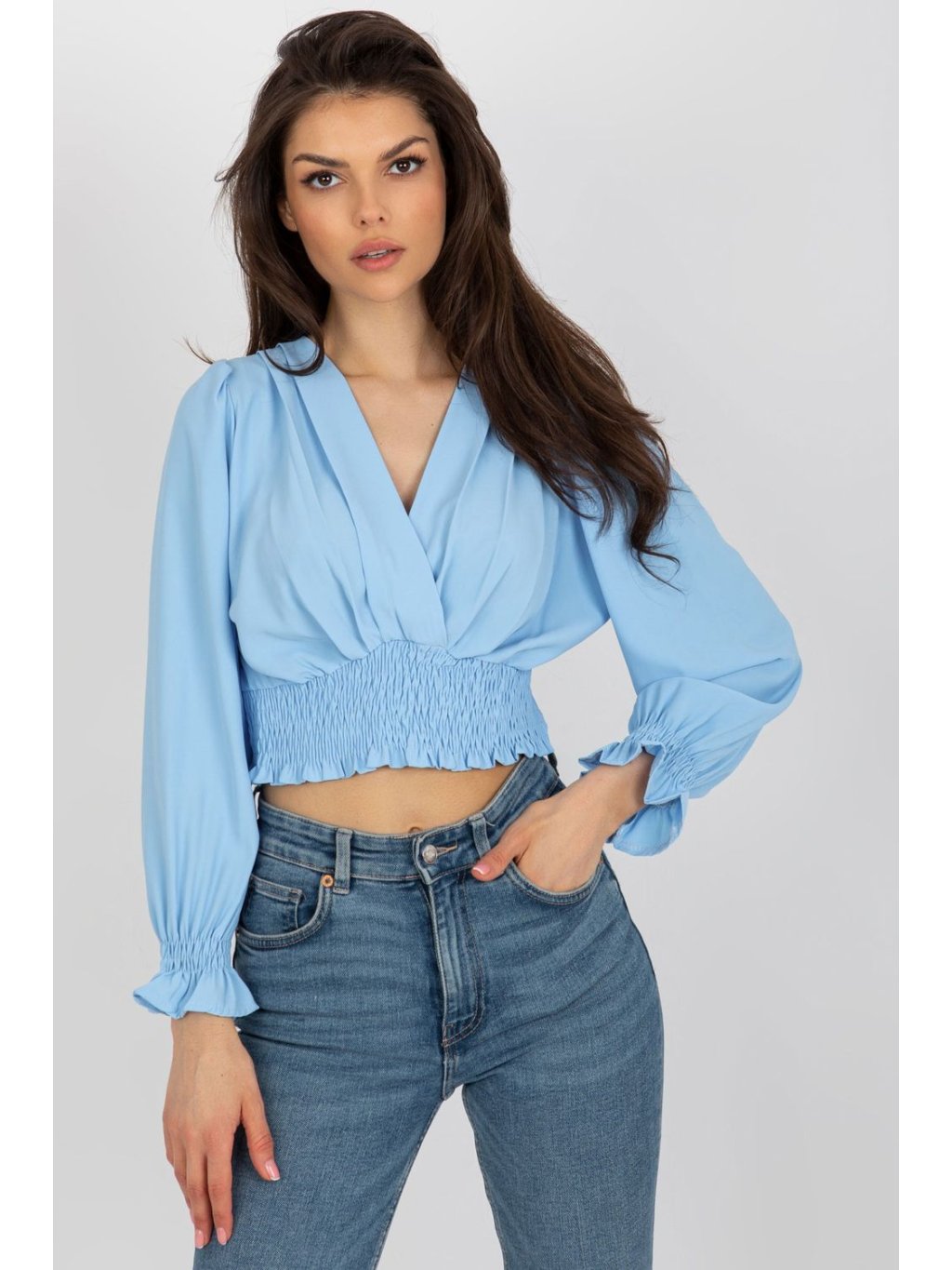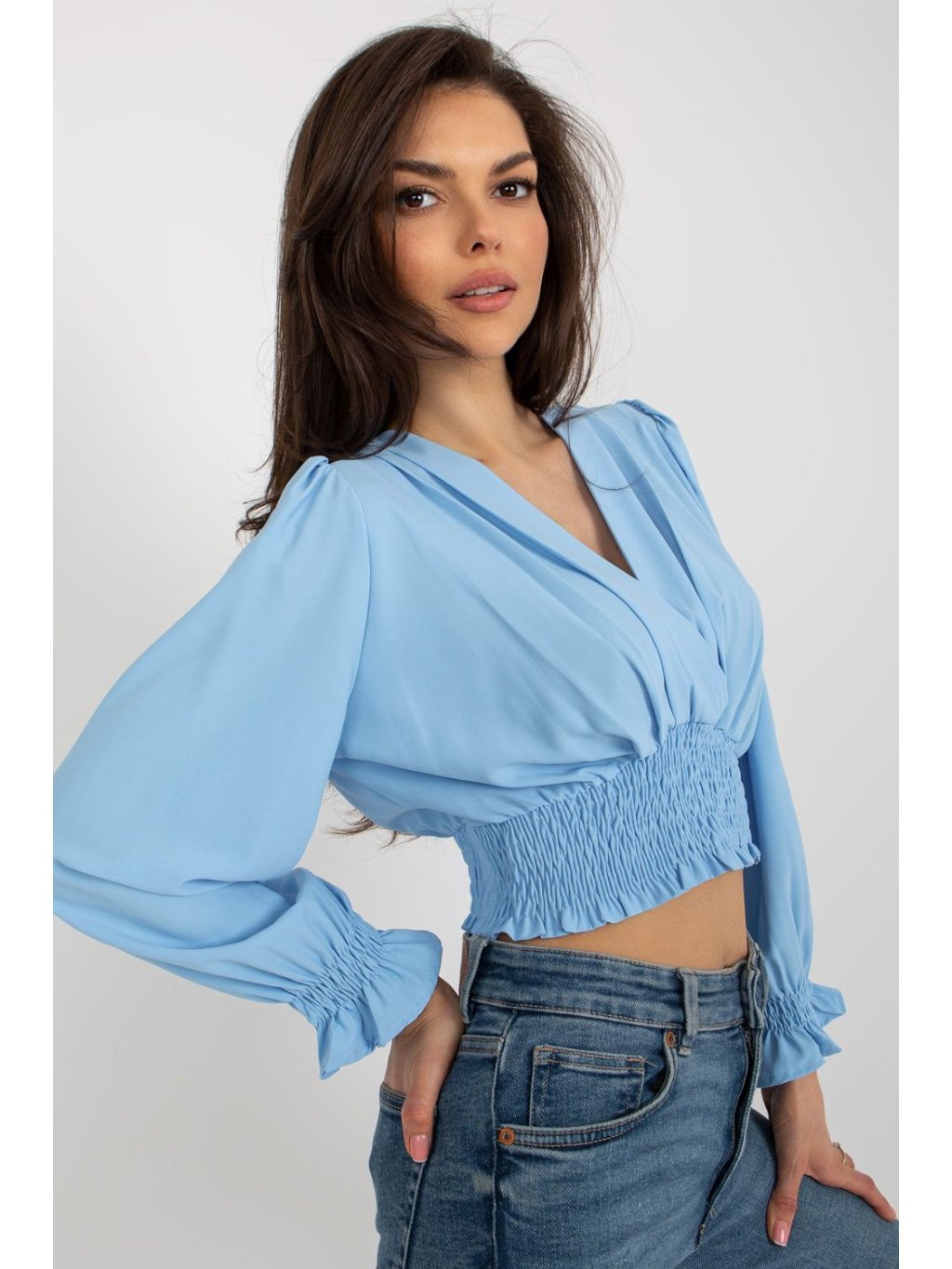 Halenka s obálkovým výstřihem a dlouhými rukávy. Široká podpůrná guma ve spodní části halenky.
