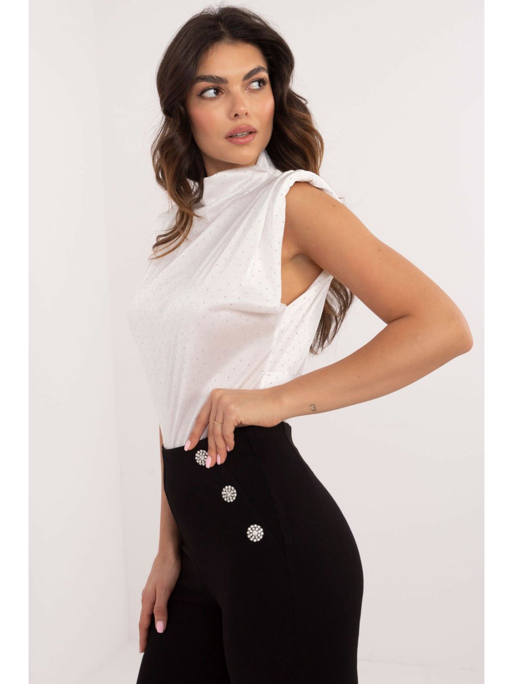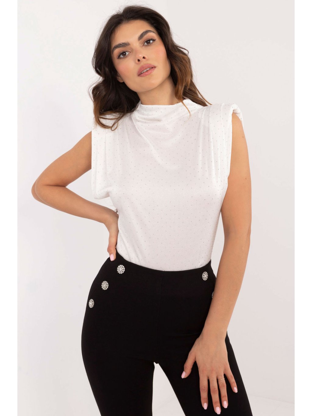 Elegantní blůza ideální na formální události, do práce a také na večírky. Vyrobená z vysoce kvalitní směsi polyesteru a elastanu, poskytuje pohodlí a skvělé přizpůsobení postavě. Má vestavěné polštářky na ramenech, které jí dodávají strukturu a eleganci, decentně zdůrazňující linii ramen. Blůza má standardní délku a absence rukávů, co jí dodává moderní a lehký charakter. Kulatý výstřih harmonicky ladí s celkovým dojmem a ozdobné flitry rozmístěné po celé ploše materiálu jí dodávají lesku a rafinovanosti. Je to perfektní volba pro ženy, které oceňují styl a eleganci.