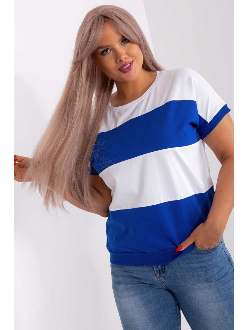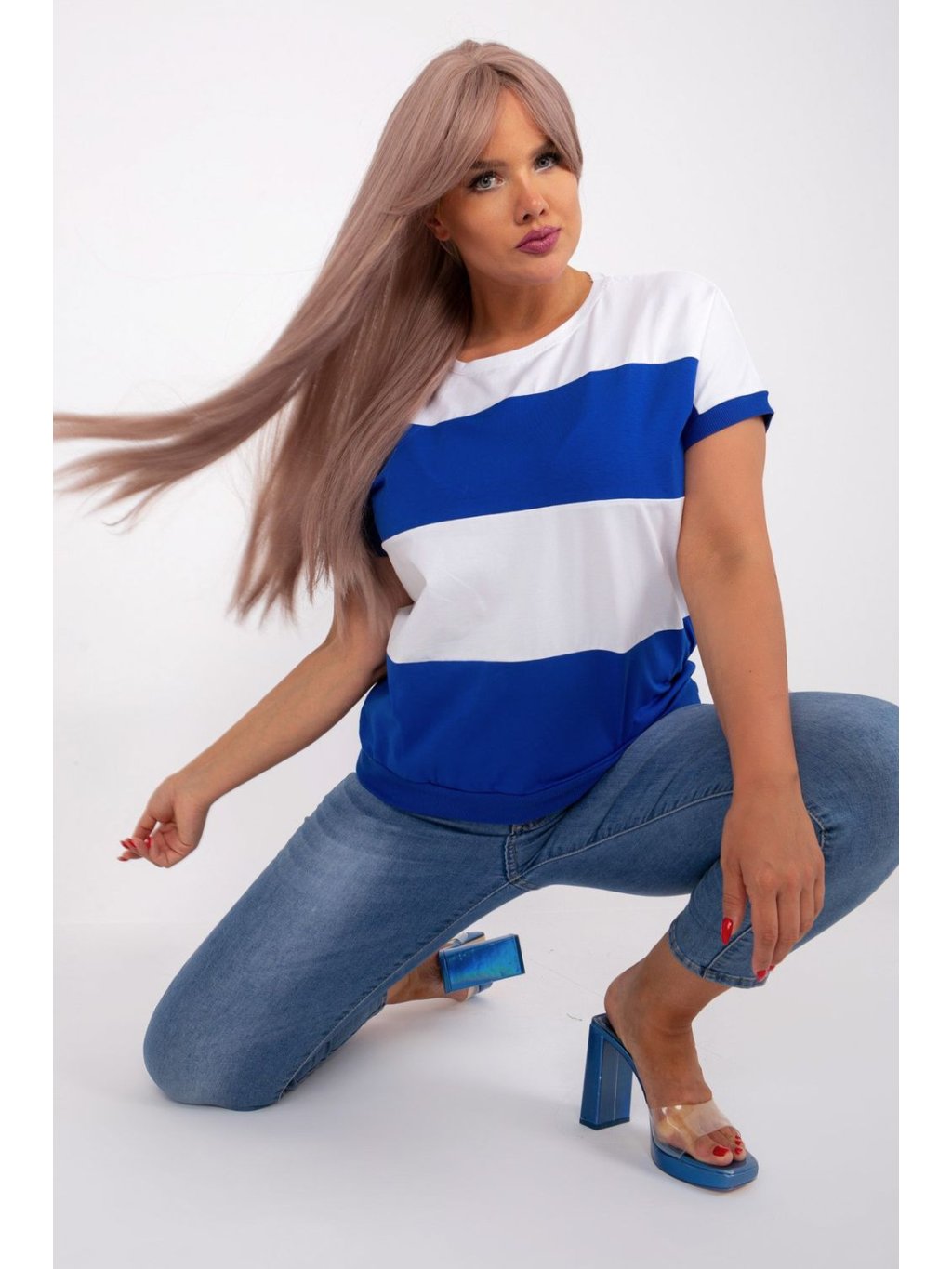 Halenka plus size s krátkými rukávy a kulatým výstřihem. Halenka je vyrobena z látky se širokými pruhy.