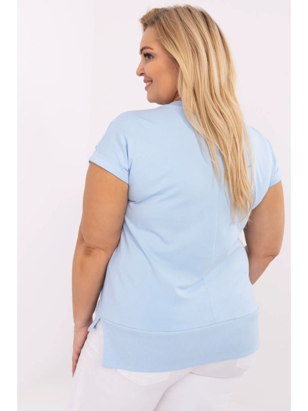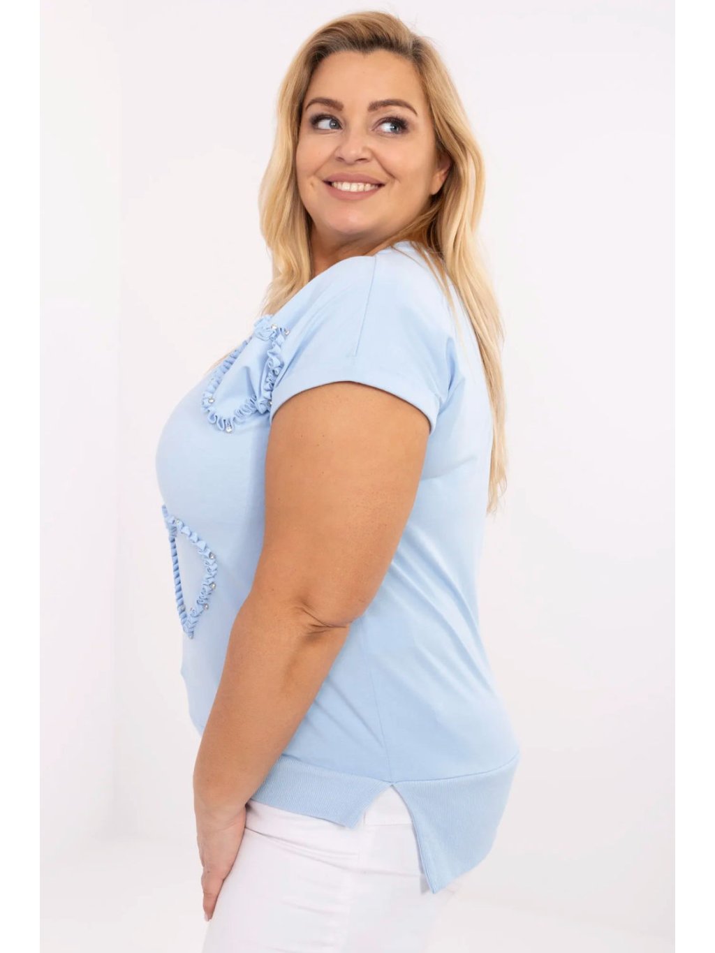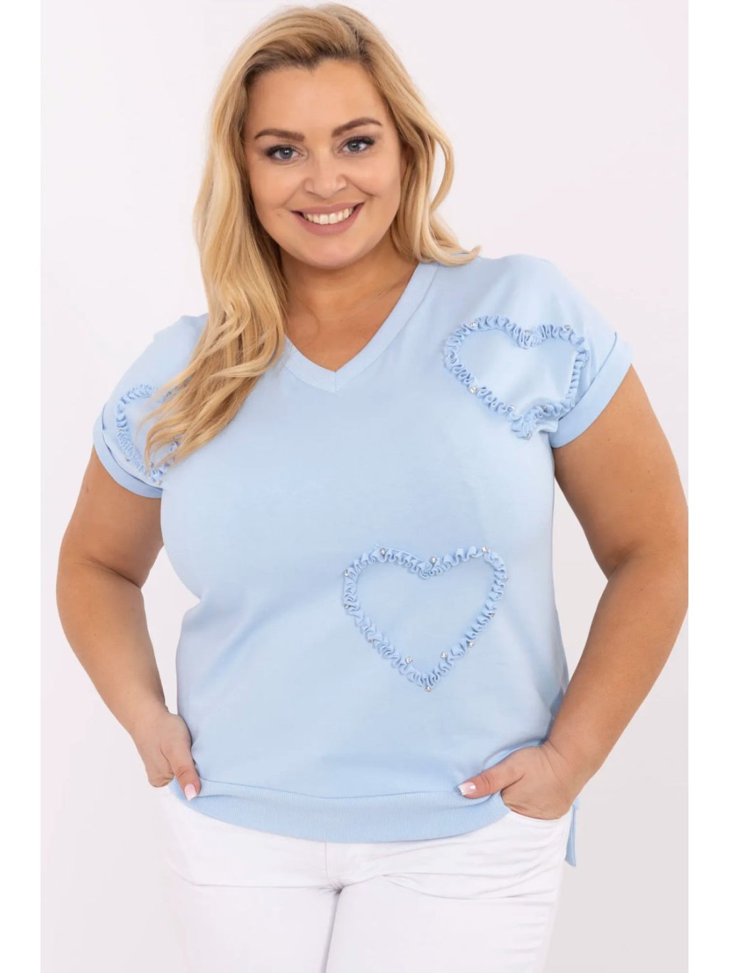 Dámský casual plus size top je ideální volbou na každý den, stejně jako do práce. Vyrobený z příjemné bavlny s přídavkem elastanu poskytuje pohodlí nošení a skvěle sedí na postavě. Standardní délka, s krátkým rukávem a ženským výstřihem do srdce, který jemně zdůrazňuje krk. Pozornost přitahuje efektní aplikace vpředu ve tvaru srdcí zdobených třpytivými zirkony, dodává blůze elegantní a zároveň jemný šarm. Skvěle se hodí k denním outfitům, stejně jako k džínům, nebo klasickým kalhotám nebo sukní. Univerzální, pohodlná a s charakterem, ideální do práce a na volnější setkání.