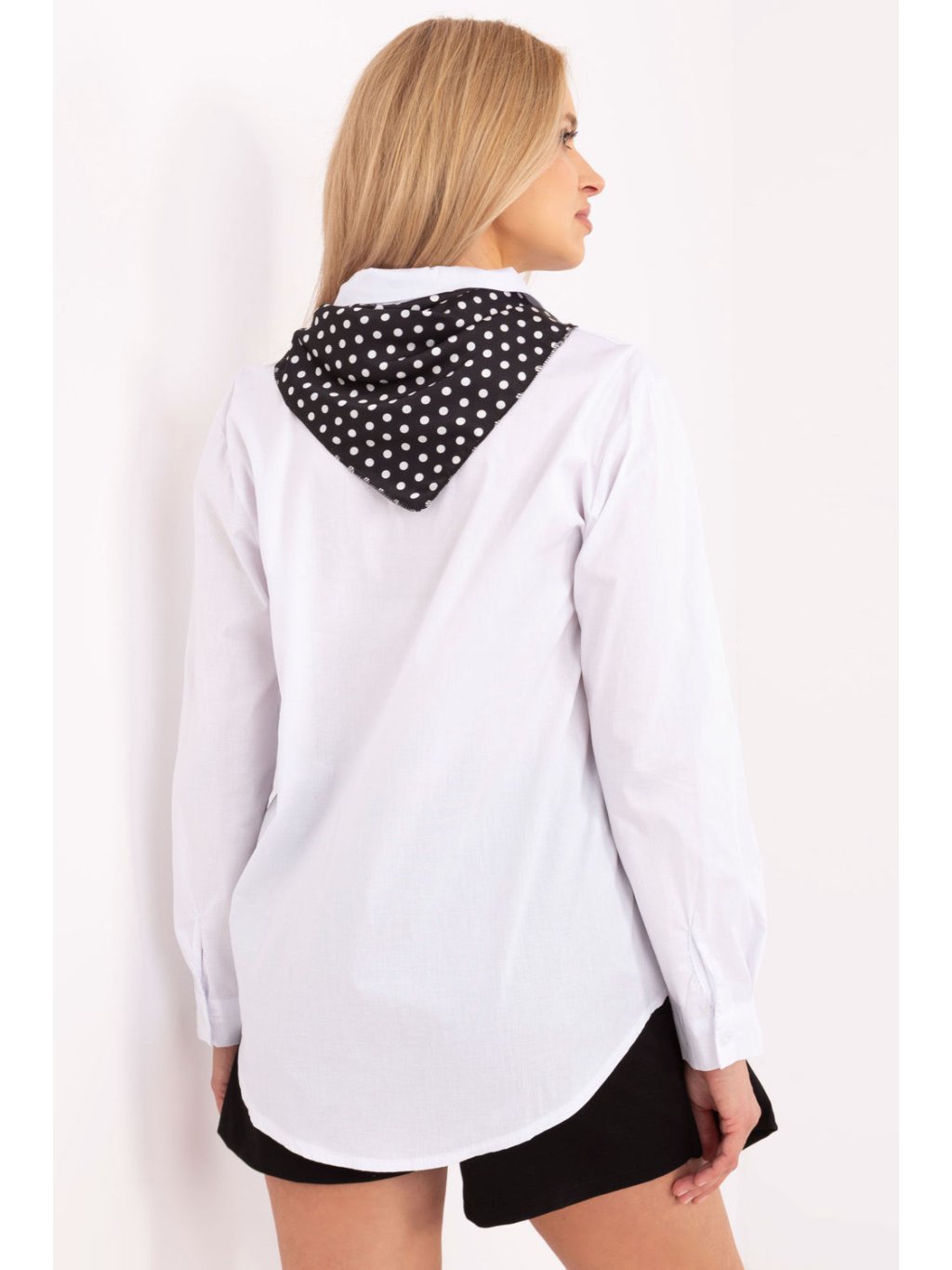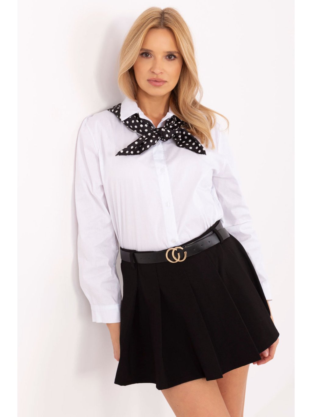 Elegantní dámská košile s klasickým střihem, ideální na společenské události, do práce nebo na každý den, kdy chcete vypadat stylově a profesionálně. Košile je vyrobena z vysoce kvalitní bavlny s přídavkem elastanu, co zaručuje pohodlí nošení a perfektní přizpůsobení. Model s klasickým límečkem a zapínáním na knoflíky je esencí nadčasové elegance. Dlouhý rukáv z ní dělá skvělý kousek na každou roční dobu. Hladká faktura materiálu jí dodává minimalistický šarm, který lze snadno sladit s různými styly. Výjimečným prvkem je odnímatelný šátek, který umožňuje jemné zkombinování outfitu. Můžete ho nosit podle příležitosti, s šálkem pro elegantnější efekt nebo bez něj pro jednodušší vzhled. Jedná se o skvělý návrh pro ženy, které oceňují klasiku s nádechem všestrannosti.
