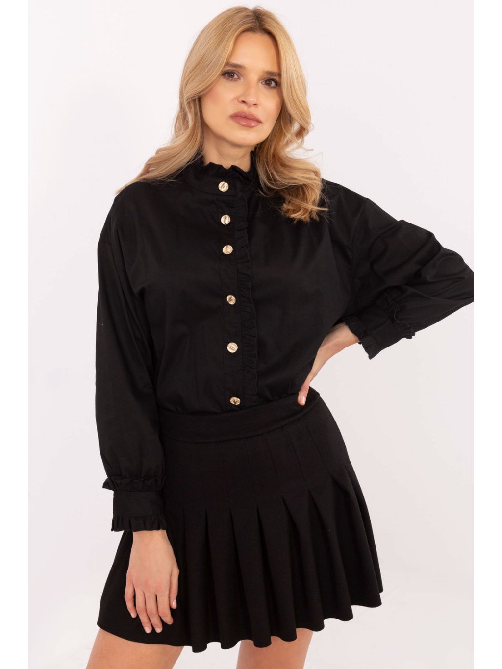 Elegantní dámská košile je ideální volbou na formální události, návštěvy nebo každodenní pracovní stylizace. Vyrobená z vysoce kvalitní bavlny s přídavkem elastanu poskytuje pohodlí a skvělé přizpůsobení postavě. Klasický hladký vzor jí dodává univerzální charakter a standardní délka jí skvěle ladí s různými kousky šatníku. Jemná volánka podél plisovaného proužku jí dodává jedinečný šarm a lehkost, prolamuje minimalistický styl. Košile s knoflíky je nadčasovým prvkem šatníku, který se hodí do každé elegantní stylizace.