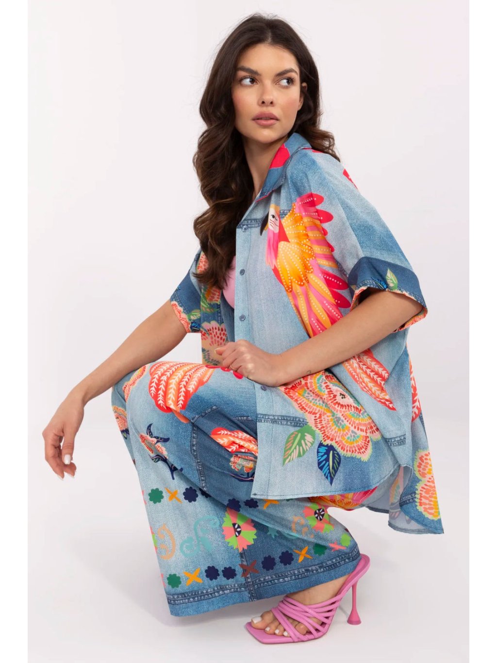 Volně střižená dámská košile, ideální na každý den, vyniká barevným potiskem, který dodává energii a stylu. Vyrobena z viskózy s přídavkem polyesteru, poskytuje pohodlí a prodyšnost, ideální na teplé dny. Košile má asymetrickou délku, krátký rukáv s otočeným lemem a klasický límec, co jí dodává elegance. Zapínání na knoflíky vpředu usnadňuje oblékání a přidává praktičnost. Tato košile je skvělou volbou pro ženy, které ocení stylový a zároveň pohodlný oblek na každý den.