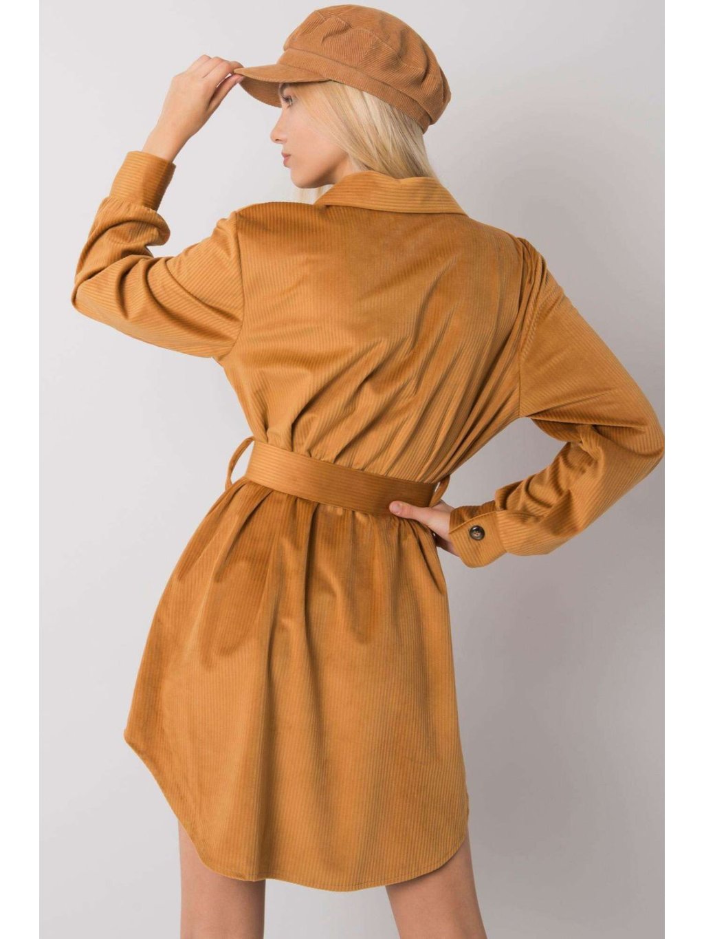Velbloudí šaty na knoflíky s dlouhými rukávy. Vzhled doplňuje pásek.