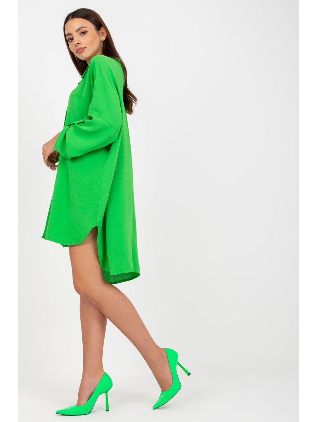 Košilové šaty s dlouhými rukávy a asymetrickým lemem. Šaty se zapínají na knoflíky, rukávy lze ohrnout. Na zadní straně rozparky s ozdobným řetízkem. Ideální pro mnoho příležitostí.