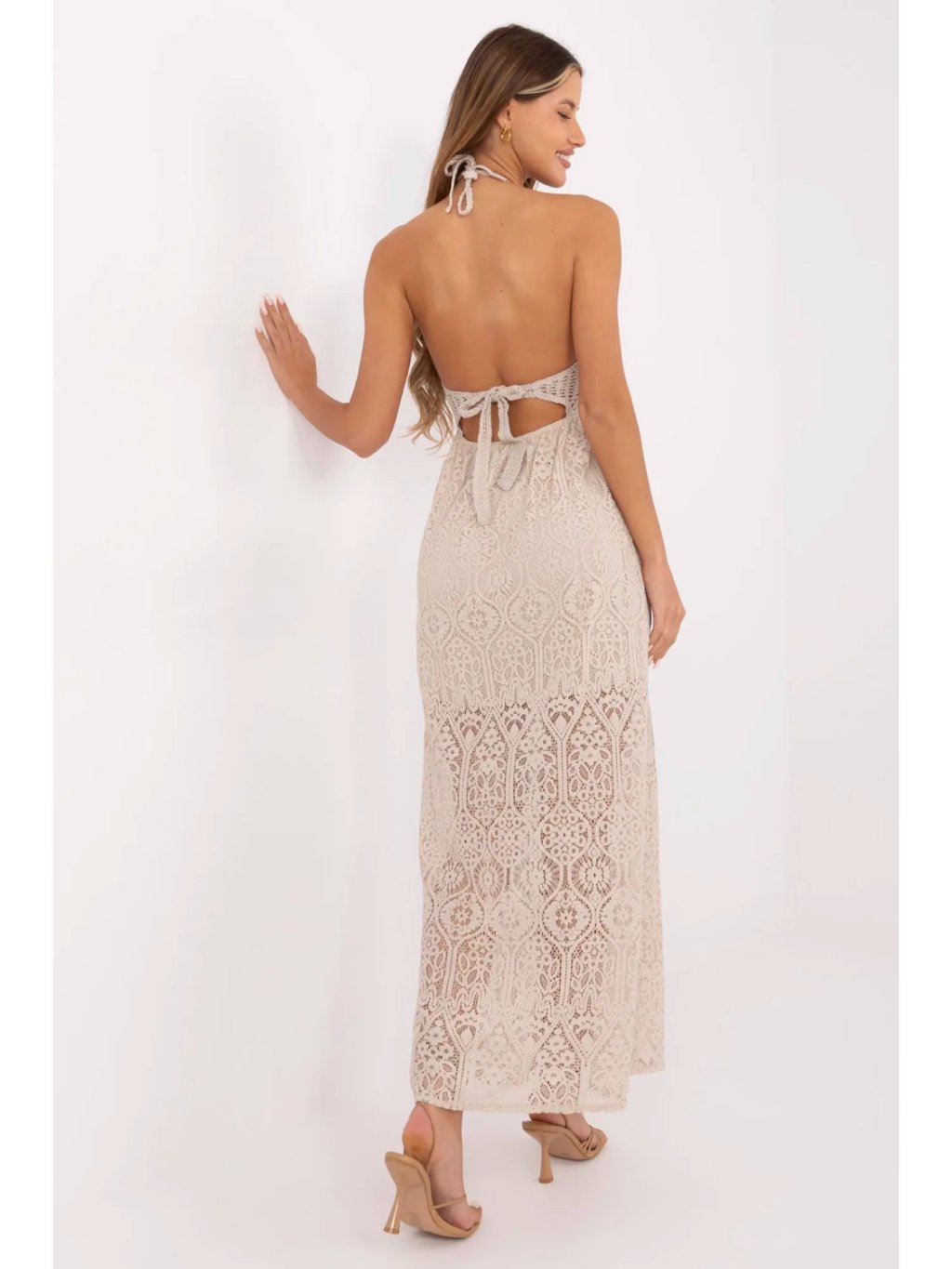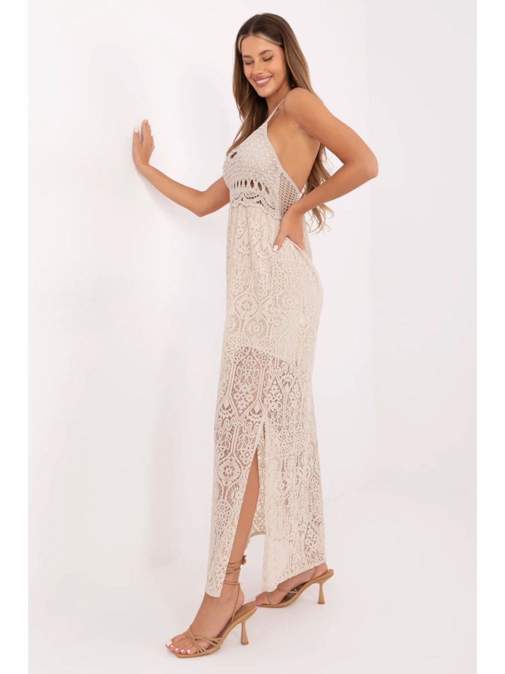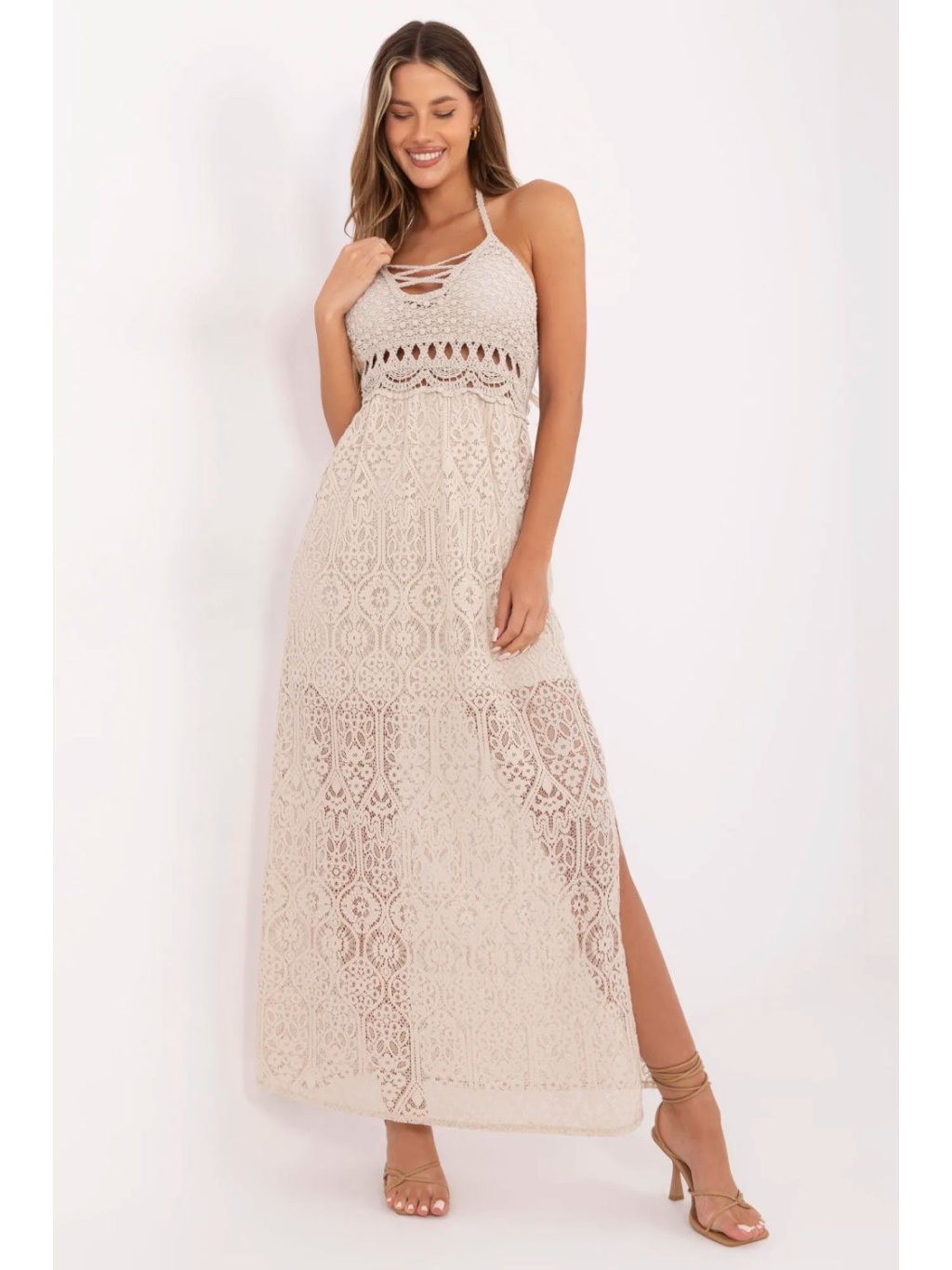 Letní šaty ve stylu boho jsou kvintesencí ženského, romantického stylu. Vyrobené z lehké směsi bavlny a nylonu, okouzlují ažurovým vzorem a decentním provedením. Rozkročený střih dodává siluetě lehkost a volnost, ideální pro každodenní letní stylizace. Model s tenkými ramínky a šněrováním na krku a zádech umožňuje perfektní přizpůsobení a zdůraznění zad. Vložené podprsenky zajišťují pohodlí a podporu bez nutnosti nošení podprsenky, což dělá šaty ještě praktičtější a pohodlnější. Maxi délka ve spojení s ažurovým provedením dodává šatům lehkost a letní šarm. Podšívka sahající po stehna zajišťuje, že šaty zůstávají pohodlné a neprůhledné v klíčových partiích, zatímco zdůrazňují krásu krajkového detailu. Je to skvělá volba na každodenní vycházky, procházky, letní večírky nebo dovolené, šaty, které spojují pohodlí, styl a ženský půvab v duchu boho.