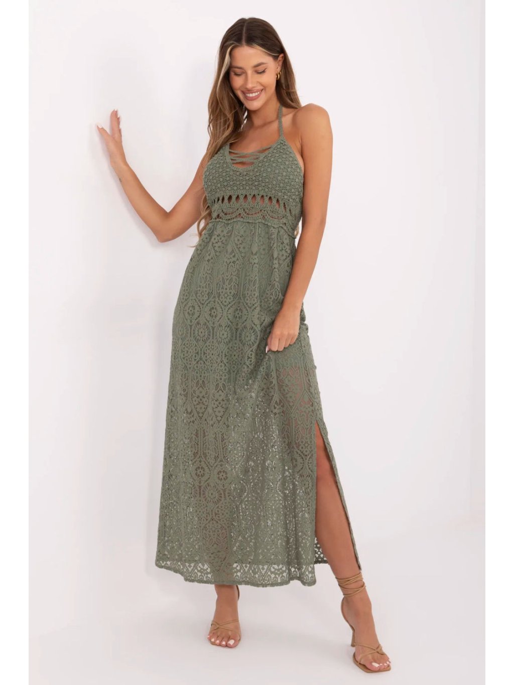 Letní šaty v boho stylu jsou kvintesencí ženského, romantického stylu. Vyrobena z lehké směsi bavlny a nylonu, očarující ažurovým vzorem a decentním zpracováním. Rozkročený střih dodává siluetě lehkost a volnost, ideální pro každodenní letní stylizace. Model s tenkými ramínky a šněrováním na krku a na zádech umožňuje perfektní přizpůsobení a zdůraznění zad. Vsazené vycpávky zajistí pohodlí a podporu bez nutnosti nosit podprsenku, co dělá šaty ještě praktičtější a pohodlnější. Délka maxi ve spojení s ažurovým zpracováním přidává šatům lehkost a letní kouzlo. Podšívka sahající do výšky stehen zajišťuje, že šaty zůstávají pohodlné a neprůhledné v klíčových částech, zároveň zdůrazňují krásu krajkového detailu. Jedná se o skvělou volbu na každodenní vycházky, procházky, letní večírky nebo dovolené, šaty, které spojují pohodlí, styl a ženský šarm v duchu boho.