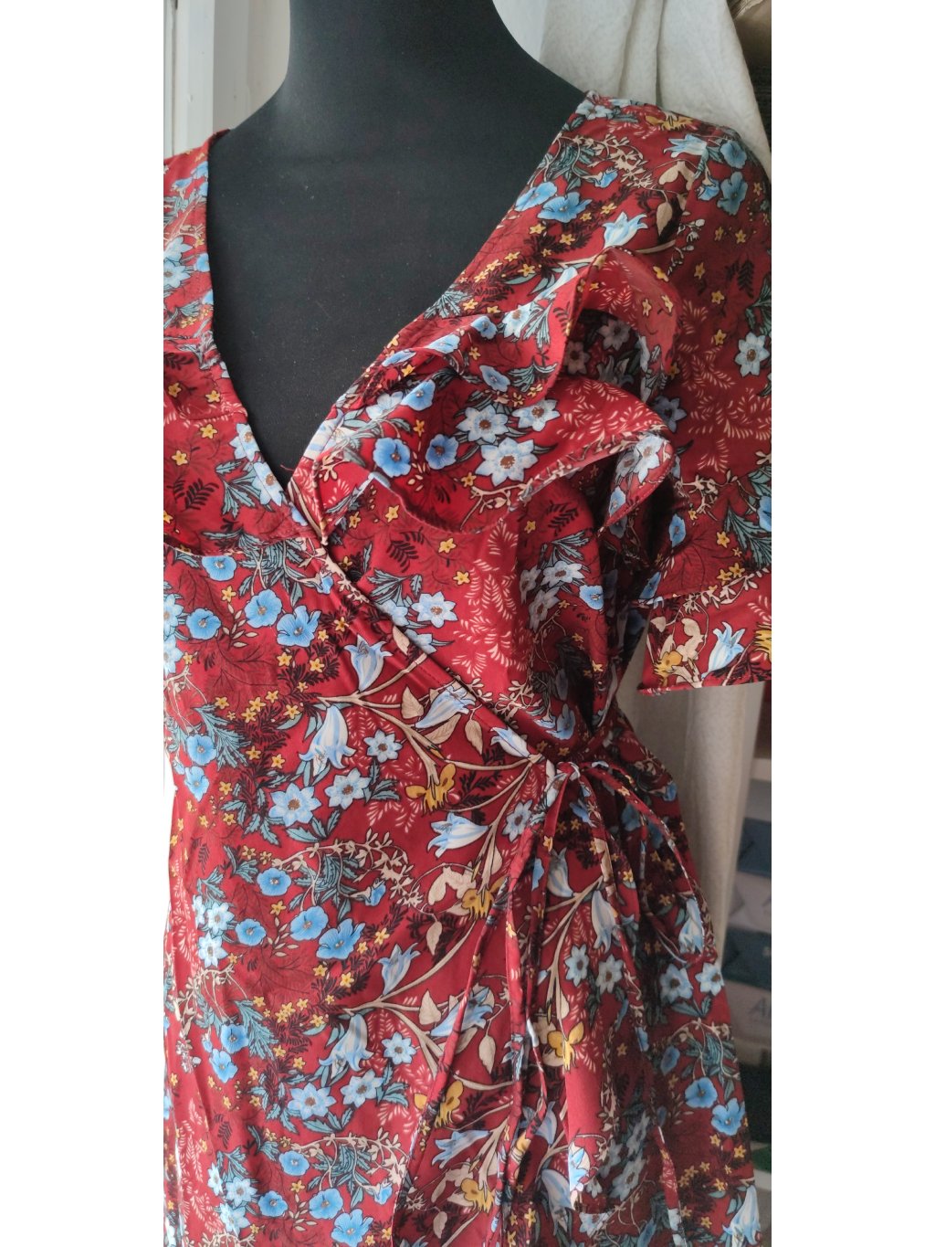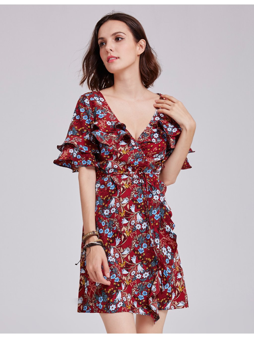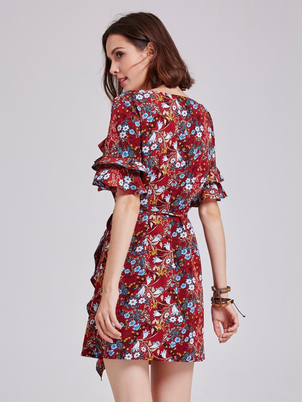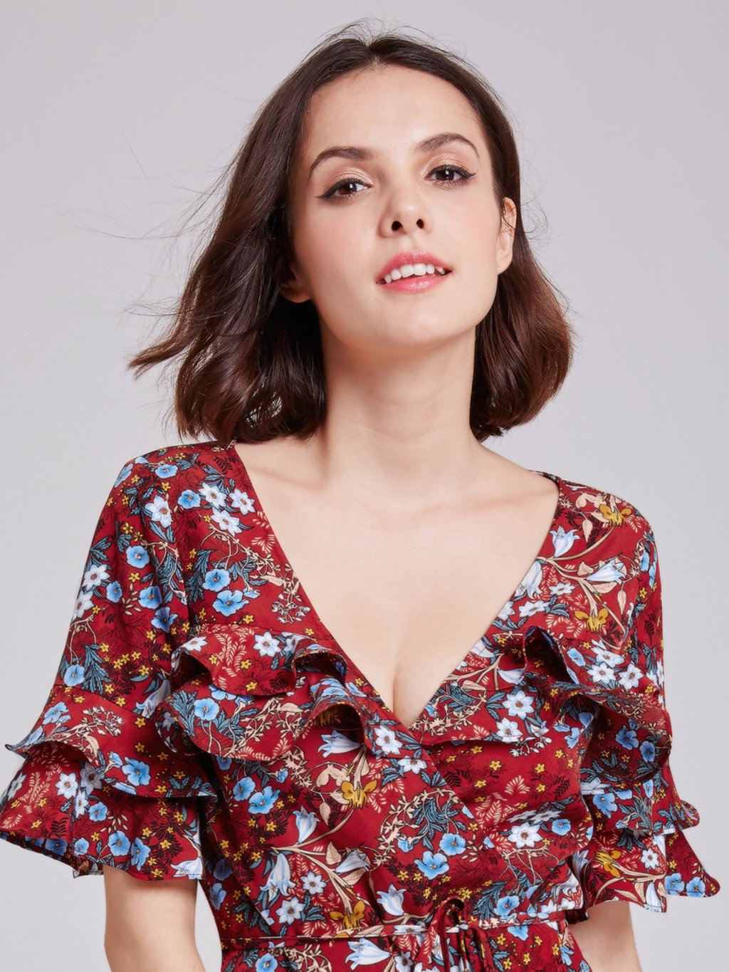 Krátké letní šaty vínové barvy s drobným vzorem květů. Šaty mají krátké rukávy, véčkový výstřih, zdobený volánky. V pase na zavazování - takzvané zavinovací šaty.