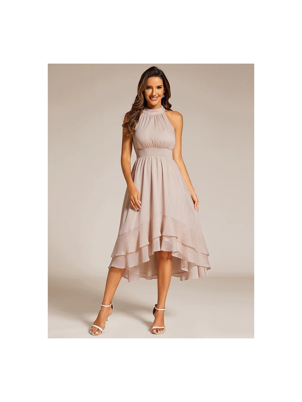 Šaty krémové střední délky s ohlávkovým výstřihem , v zadu zapínání až ke krku s velkou mašlí, bez rukávů. Dole na šatech je široký lem který jim dává bohatost.