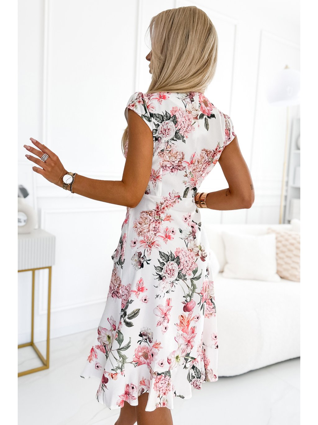 Zavinovací šaty s broskvovými květy na světlém pozadí. Vyrobené z příjemného materiálu na dotek (95% polyester, 5% elastan). Značka Numoco. Výroba v Polsku.