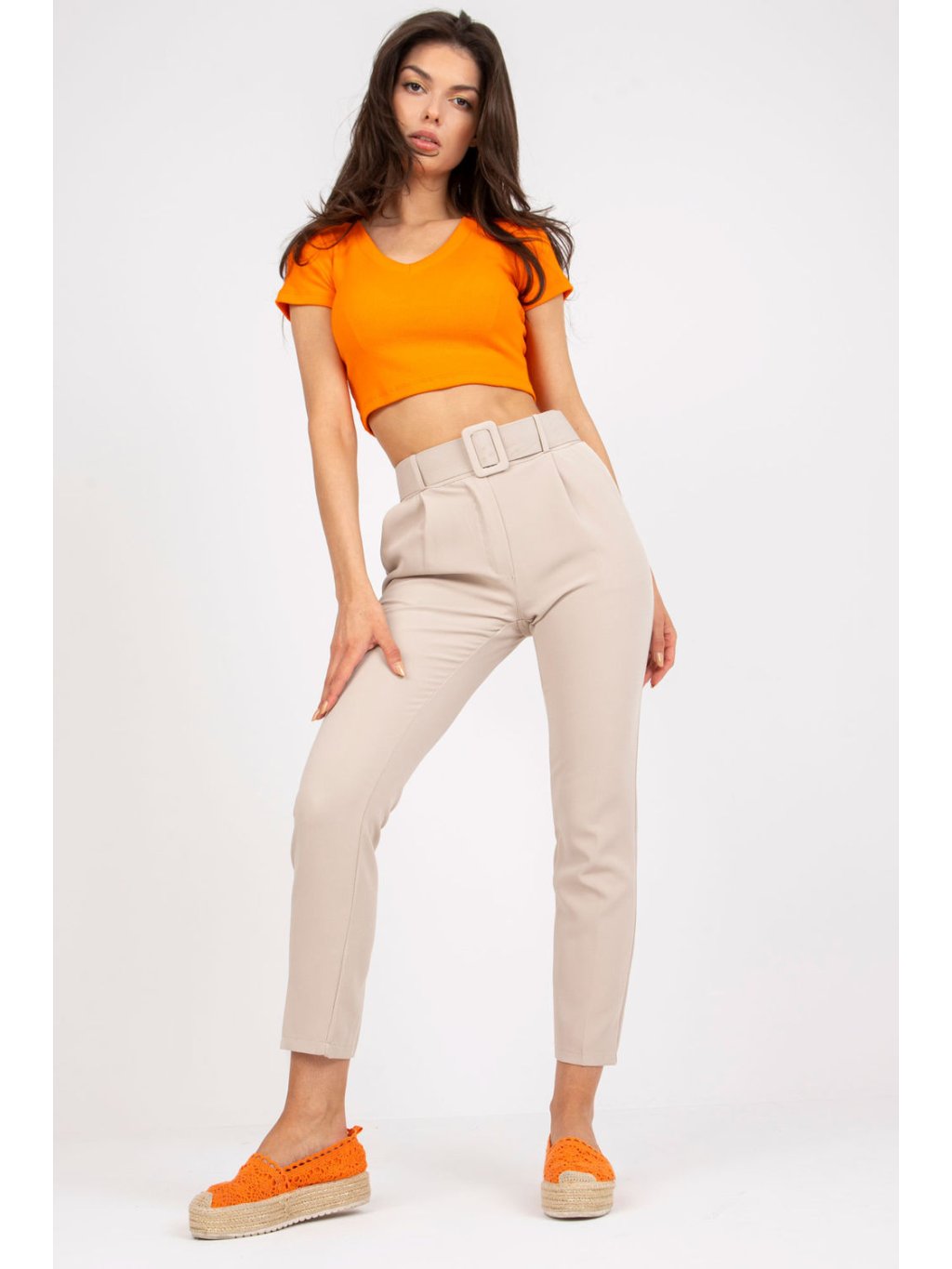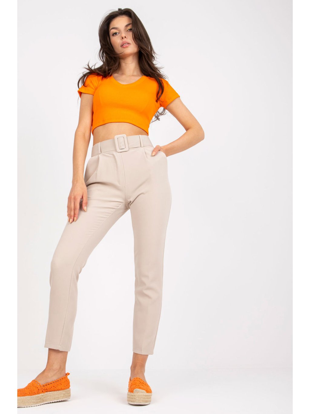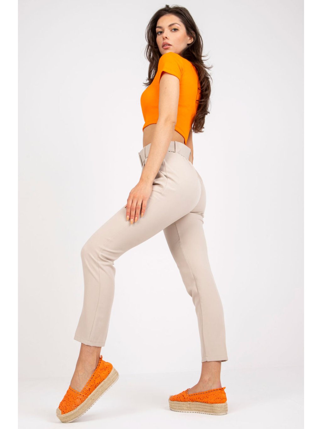 Dámské kalhoty s vysokým pasem, zipem a knoflíky. Kapsy na bocích. Pás je součástí dodávky.