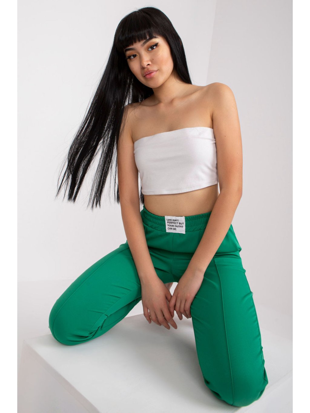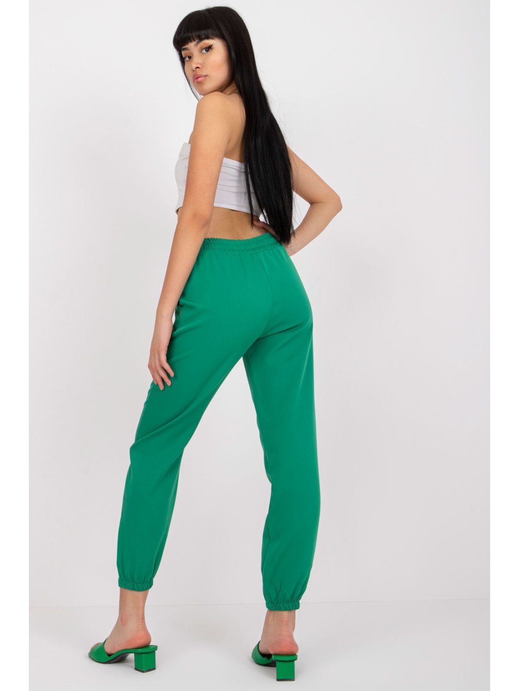 Dámské látkové kalhoty s elastickým pasem. Kalhoty s vysokým pasem a bočními šikmými kapsami.