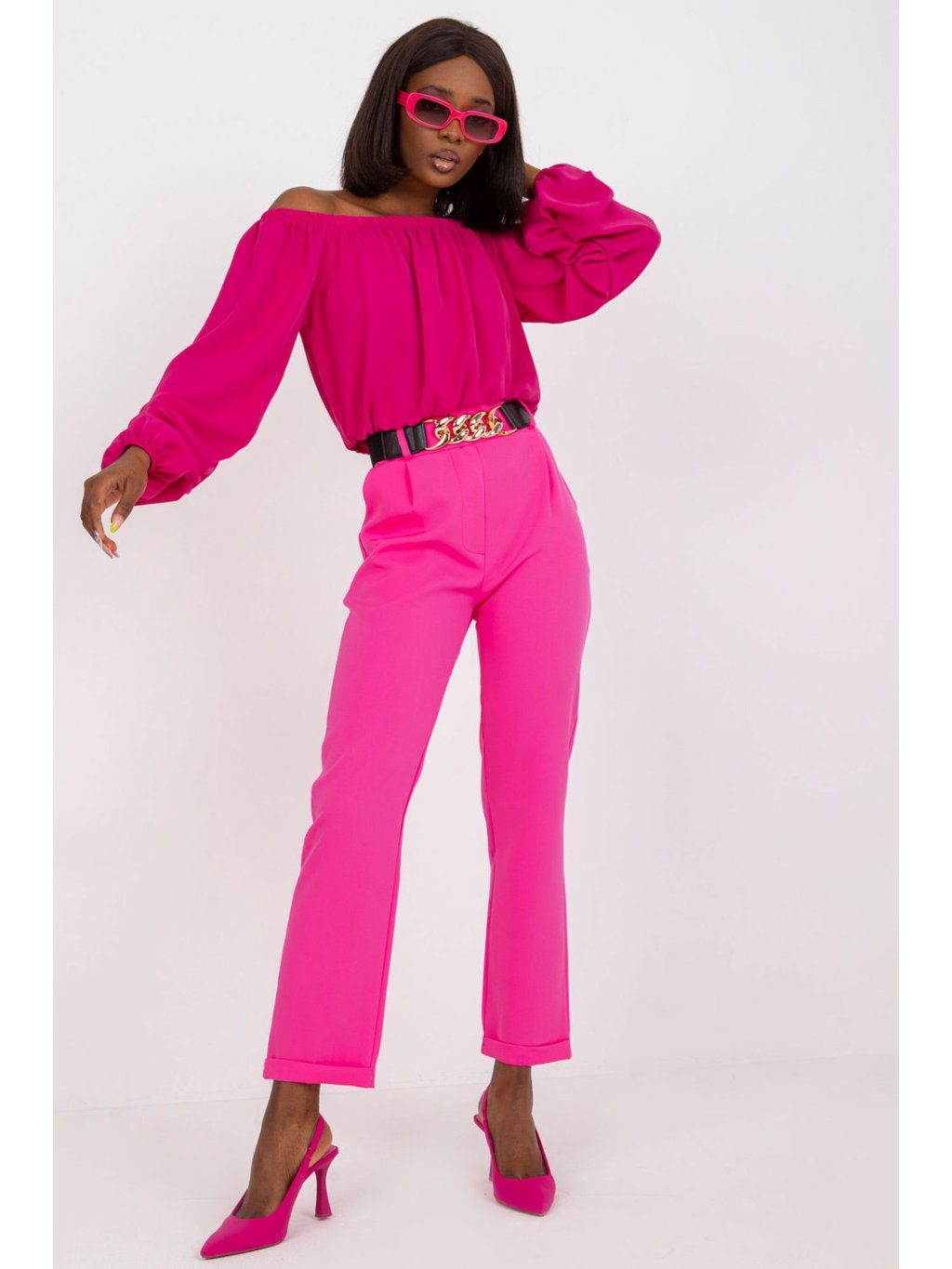 Kalhoty s vysokým sedem, elastickým pasem a ozdobným páskem. Kapsy na bocích. Mají hladký vzor, takže je lze nosit na večer, na rande nebo do práce.