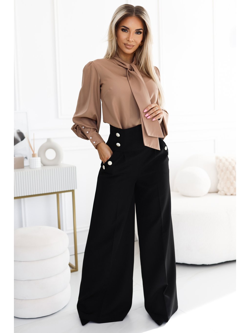 Elegantní široké kalhoty značky Numoco jsou klasickým návrhem ideálním na formální a večerní příležitosti. Vyrobené z hladkého, matného materiálu v černé barvě, vynikají vysokým pasem a efektními zlatými knoflíky, které jim dodávají eleganci. Jejich pohodlný a zároveň stylový střih zaručuje pohodlí nošení a nadčasový vzhled. Polský výrobek, vytvořený s ohledem na ženy ocení eleganci a kvalitu.