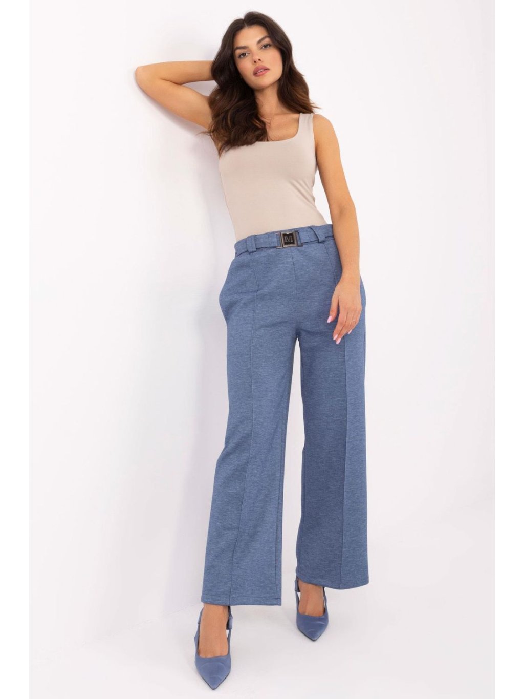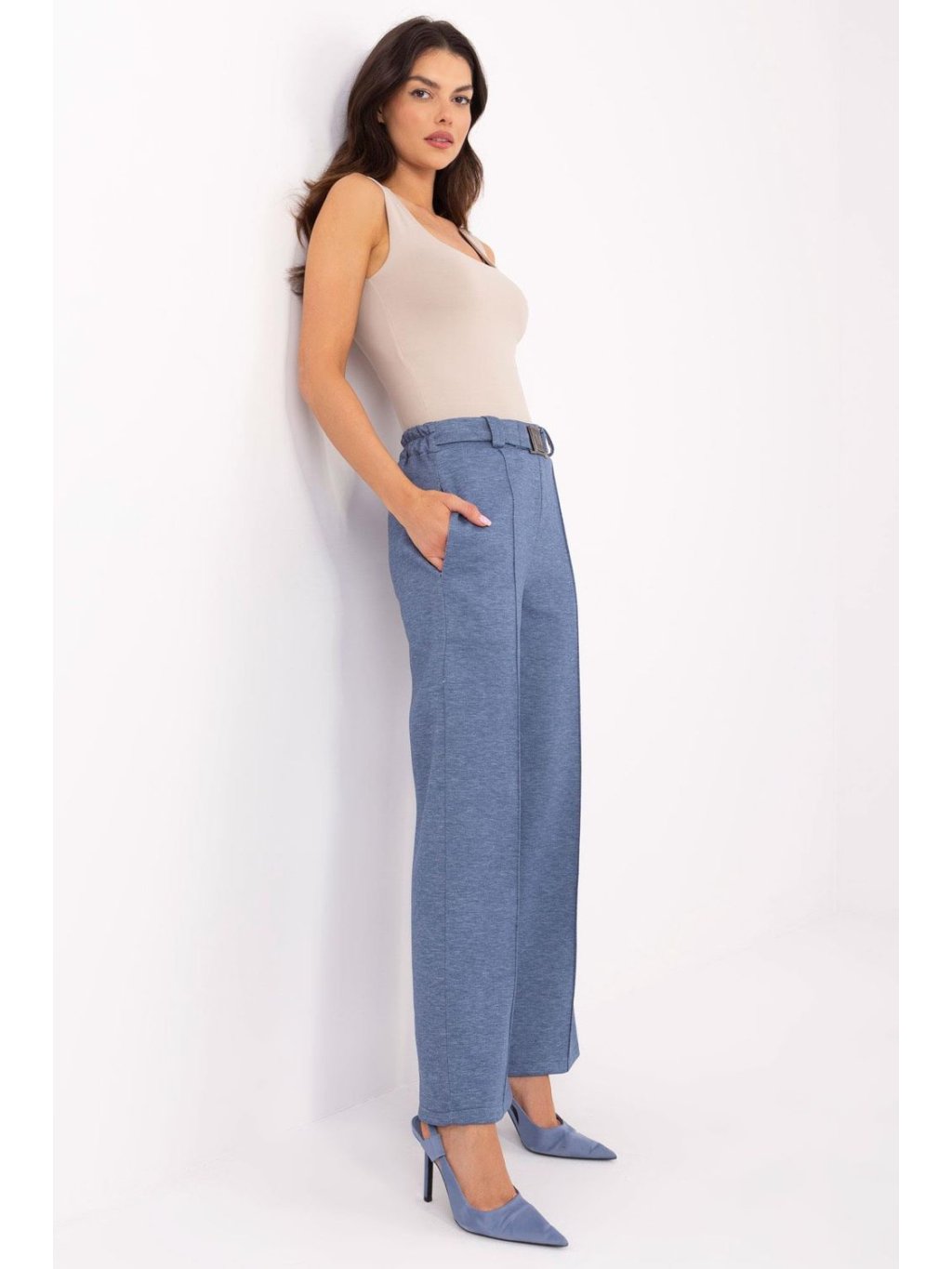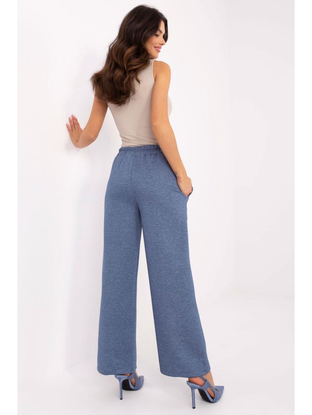 Pohodlné a stylové dámské tepláky jsou skvělou volbou na každý den. Vyrobené z vysoce kvalitní směsi polyesteru, viskózy a elastanu, poskytují pohodlí a volnost pohybu. Vysoký pas s elastickou gumou vsazenou vzadu v pase zaručuje ideální přizpůsobení a zdůrazňuje postavu. Přímé nohavice s elegantním lemem jim dodávají elegantní charakter, díky čemuž skvěle spojují pohodlí se stylem casual. Kalhoty nemají klasické zapínání, ale jsou vybaveny praktickým, zapínacím páskem, který jim dodává rafinovaný vzhled. Další výhodou jsou boční, vsunuté kapsy, které zvyšují funkčnost. Ideální jak pro každodenní stylizace, tak i pro elegantnější outfit.