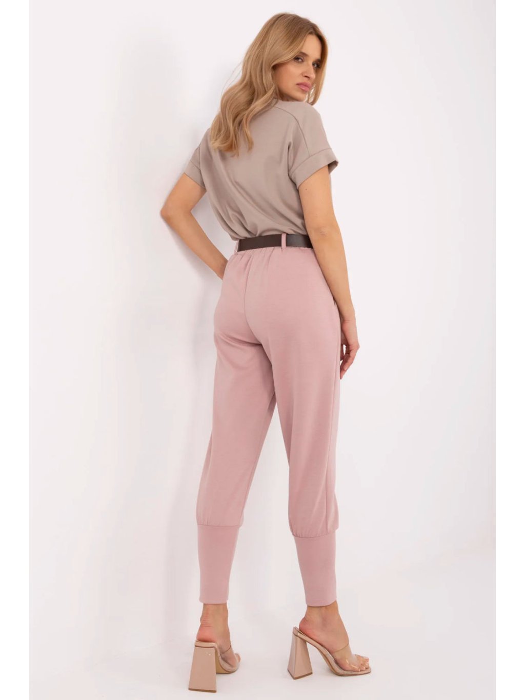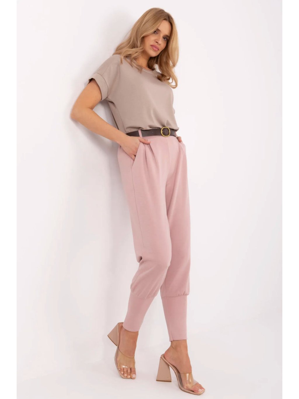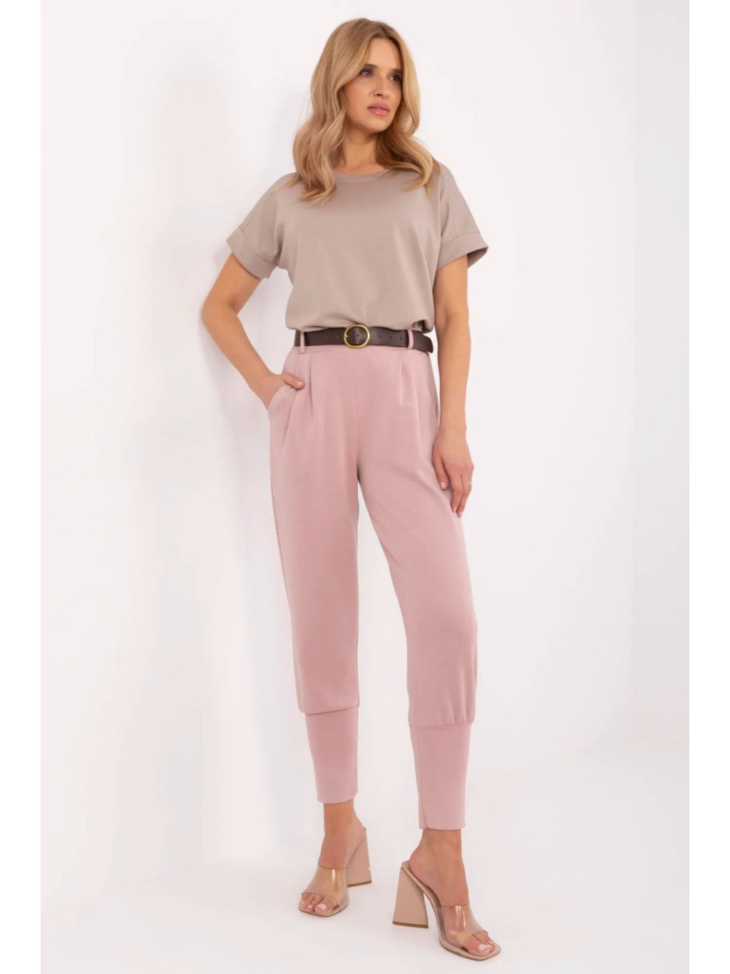 Elegantní dámské teplákové kalhoty spojující casual styl s nádechem elegance. Vyrobené z vysoce kvalitní směsi polyesteru, viskózy a elastanu, zajistí pohodlí a skvělé padnutí. Vysoký pas s gumou na zadní straně zaručuje pohodlí nošení, a zapínací pásek zdůrazňuje pas a dodává eleganci. Hladký materiál dělá z těchto kalhot skvělý kousek jak na každodenní nošení, do práce, tak i na více slavnostní příležitosti. Model má boční kapsy a nohavice jsou zakončeny lemy, což jim dodává moderní charakter. Ideální pro ženy, které oceňují styl a pohodlí.